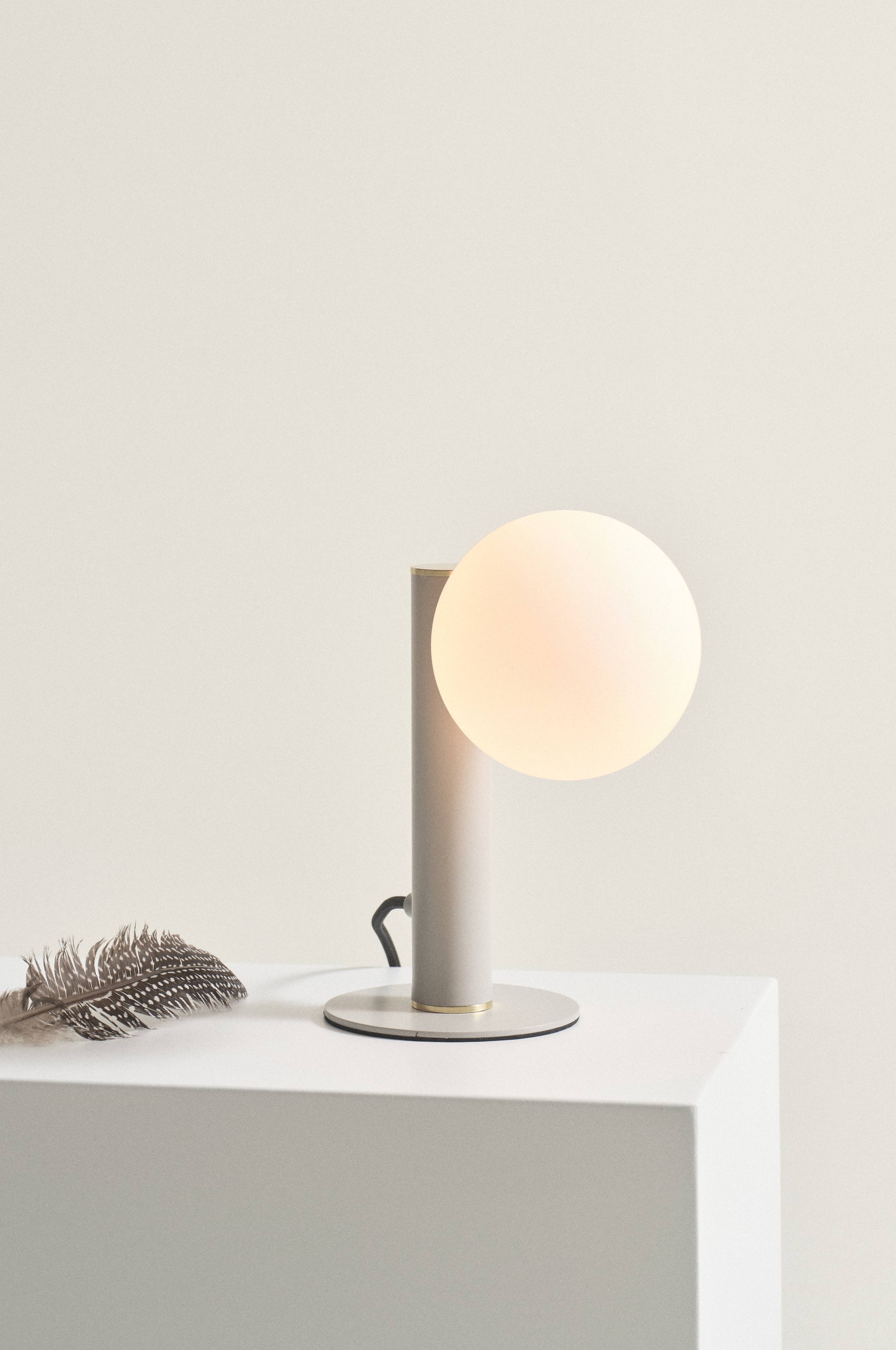 Een elegante tafellamp met een ijzeren voet en een ronde bol van wit glas. ABBEY is een spannende mix van modern en retro. De goudkleurige details geven de lamp een luxe uitstraling. De lamp heeft een dimbare schakelaar op het snoer.