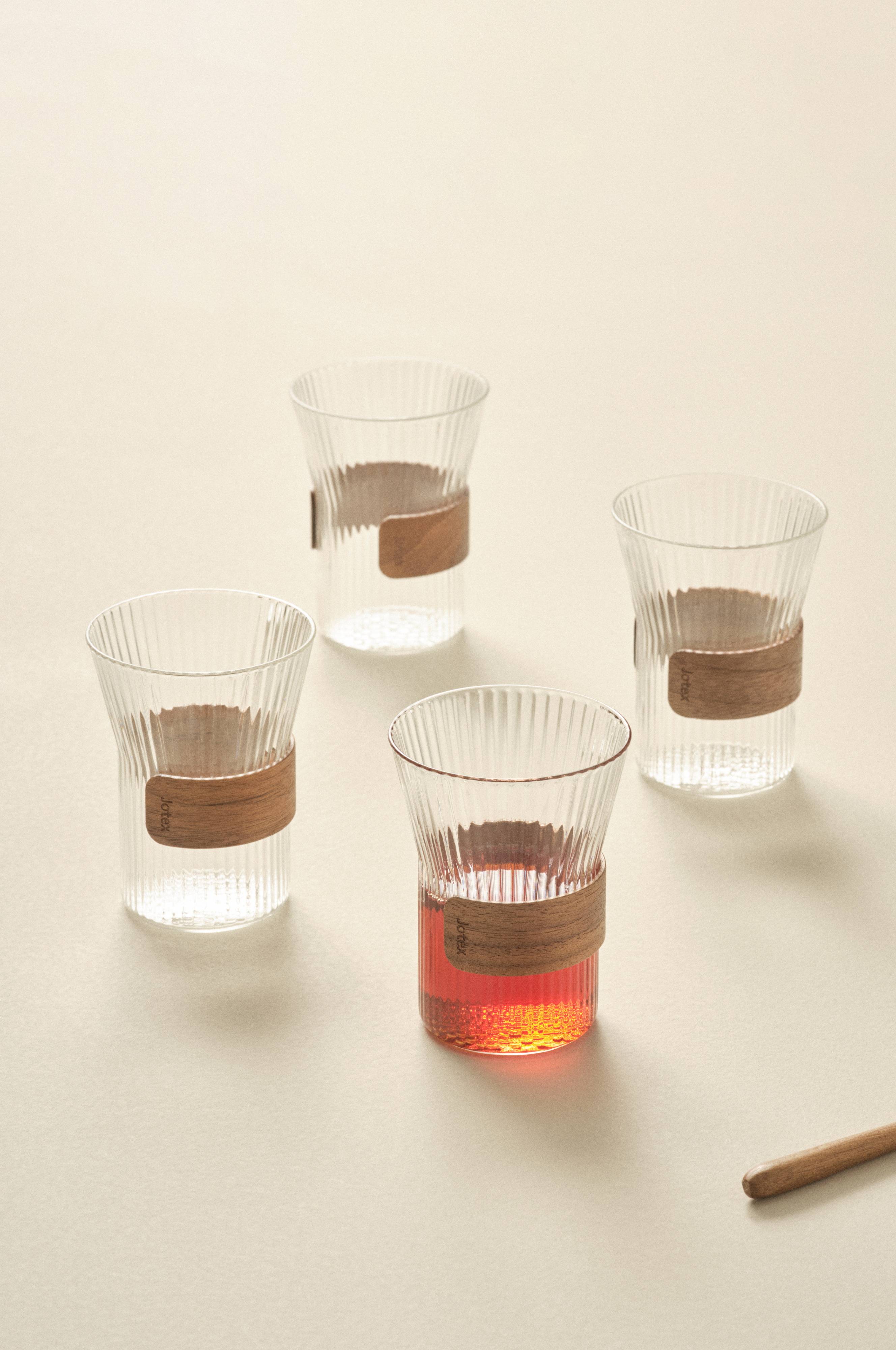 Een set van vier glazen bekers met reliëfstrepen en een bamboe handgreep. Het onderste gedeelte van het glas is recht en wordt omsloten met een greep van bamboe. Boven de greep krijgt het glas een bredere opening. ADRIA is geschikt voor warme dranken en de greep isoleert zodat je de mok goed kunt vasthouden als je iets warms drinkt.