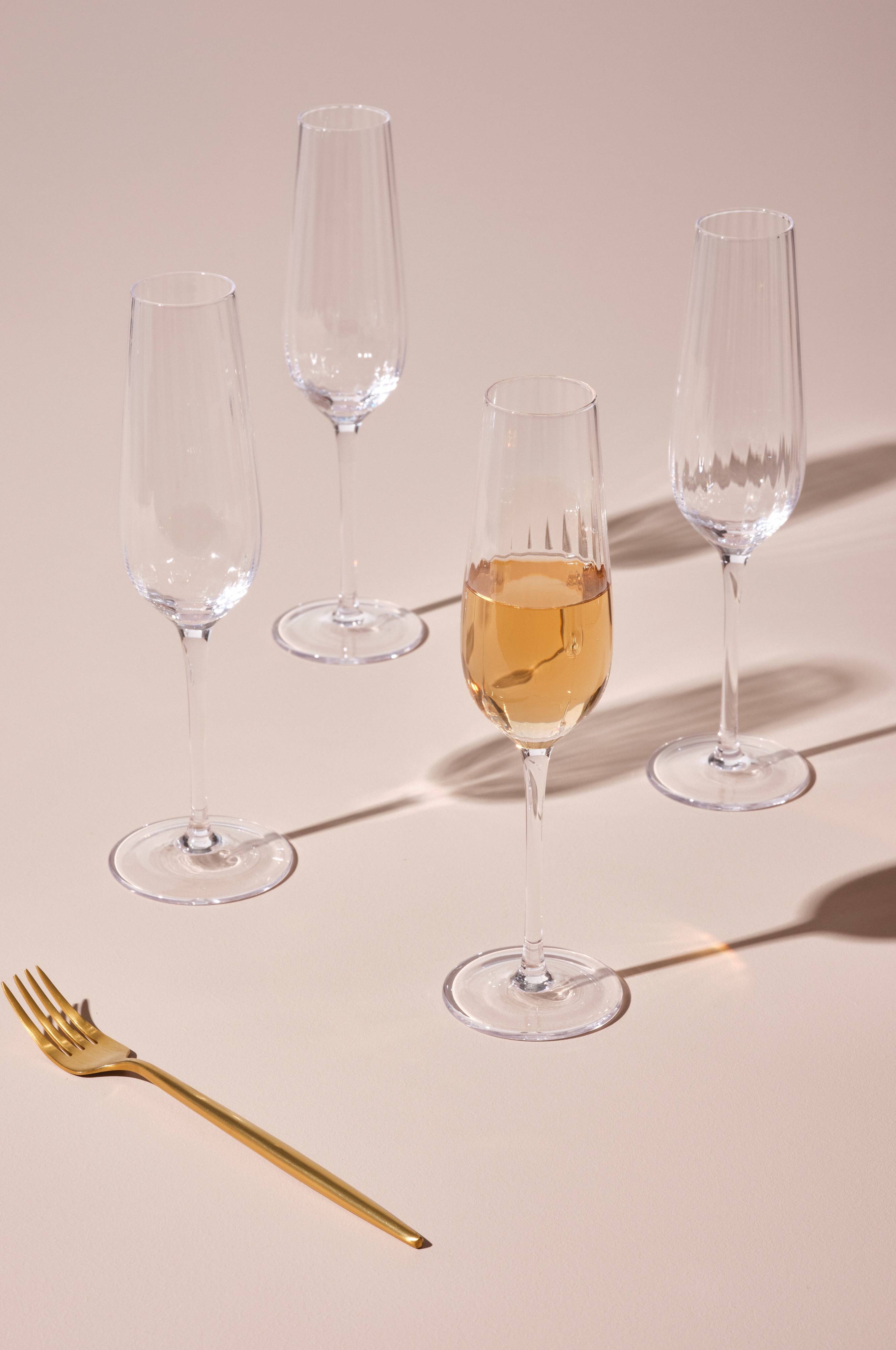 Een set van vier champagneglazen van cadmiumvrij glas. De glazen uit de serie AKIA staan op een smalle, slanke voet. De kelk heeft een gladde buitenkant en een geribbelde binnenkant waardoor er een streepdessin in het glas ontstaat. AKIA ligt goed in de hand en doet je drankje recht aan. 23 cl per glas. Gewicht 129 gr.