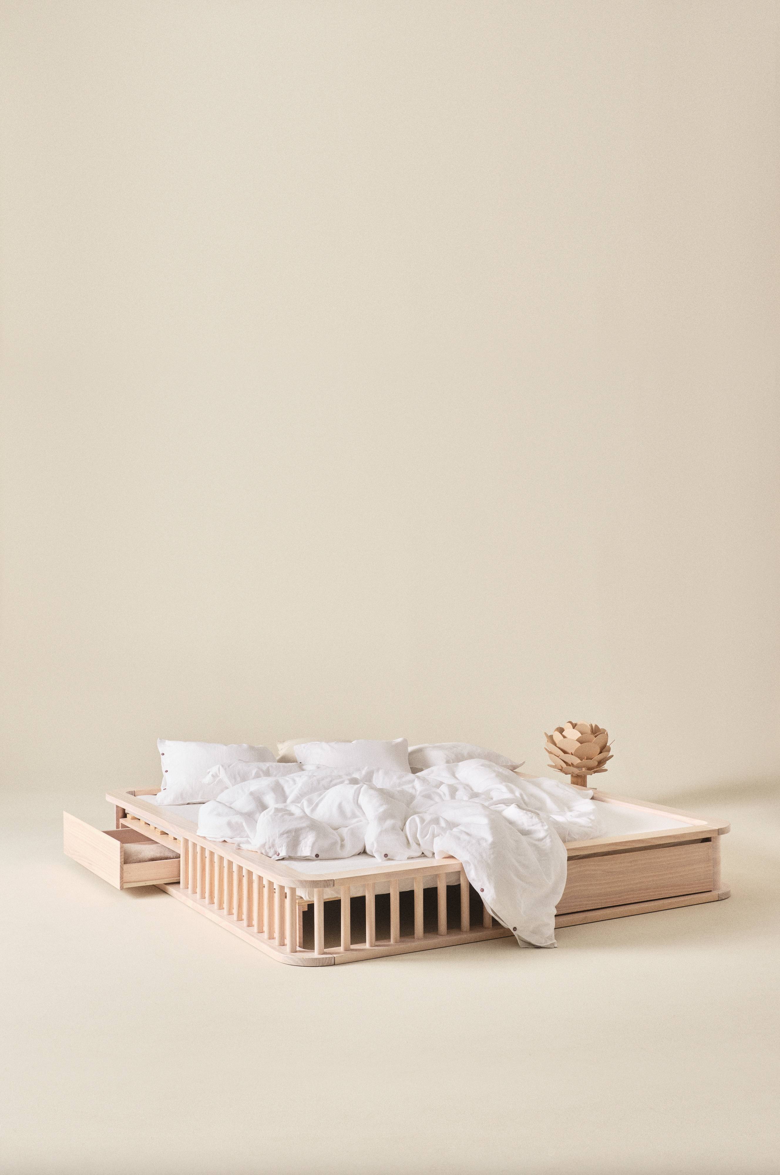 Een bedframe van massief grenen dat is afgewerkt met een watergedragen lak. Het bedframe heeft een eenvoudig, strak design met Scandinavische invloeden. Het mooie bedframe biedt bovendien praktische opbergruimte: aan beide zijkanten zit een grote lade om spullen onder het bed in op te bergen. Opbergruimte waar je eenvoudig bij kunt, zonder dat het zichtbaar is. Het bedframe heeft afgeronde hoeken. Het bedframe ALEC is van massief grenen en heeft een degelijke afwerking. Het is het ideale bedframe voor je slaapkamer. De constructie met decoratieve latjes aan de zijkanten zorgt voor ventilatie en aangenaam slaapcomfort, omdat de lucht vrij onder het bed door kan stromen. Het bedframe heeft een lattenbodem van multiplex. Maak het bed compleet met een matras naar wens. Matras/boxspring niet inbegrepen. Enige montage is vereist. Montage-instructies worden meegeleverd.