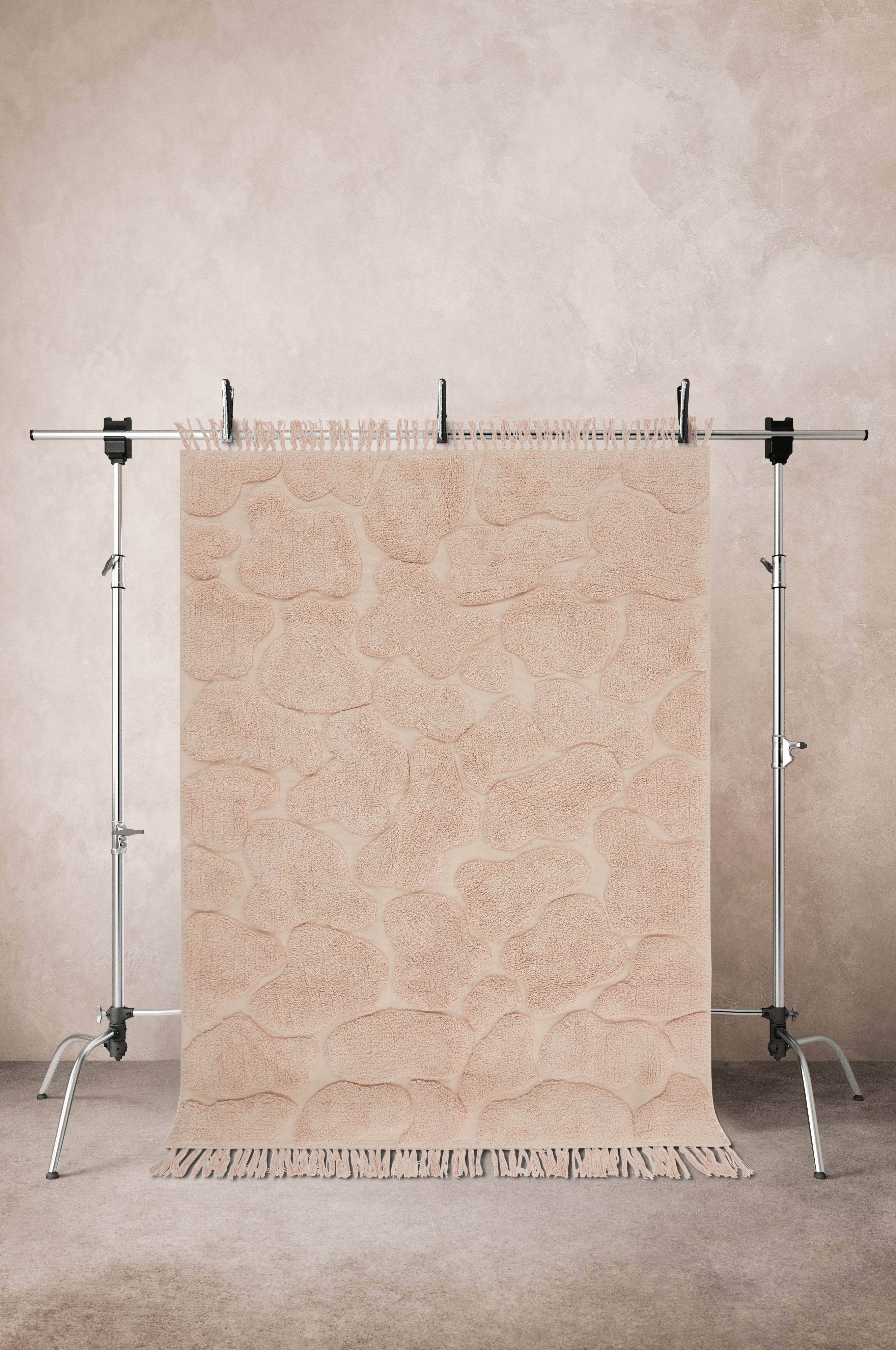 Een geweven vloerkleed van katoen met getufte delen die een prachtig dessin in de pool creëren. Het dessin is ton sur ton en doet denken aan onze grote prachtige katachtigen. Het vloerkleed heeft geknoopte franje aan de korte zijden. Lengte franje 8 cm. Poolhoogte 1 cm. Dikte 1,1 cm. 1770 gr./m².
