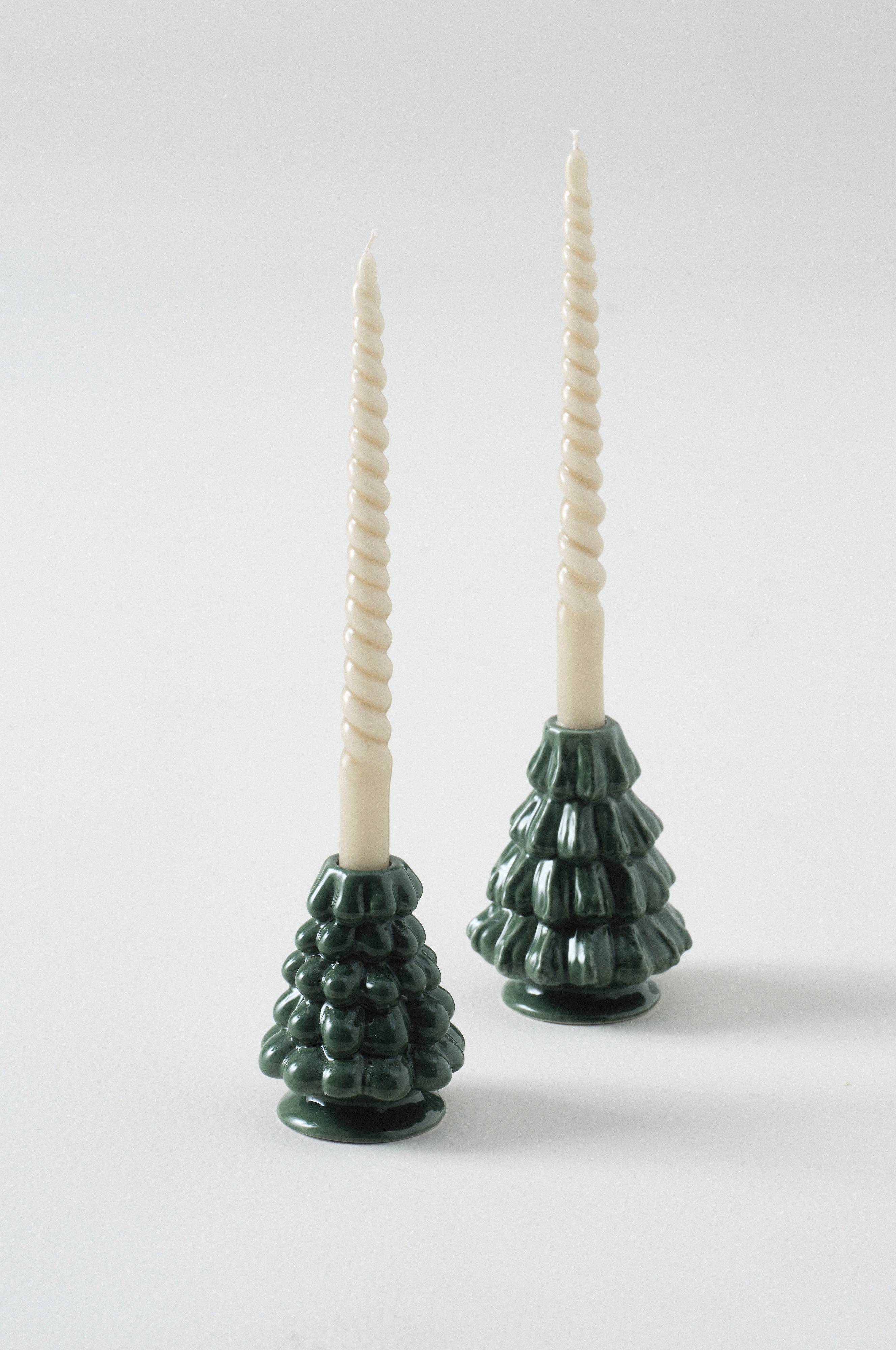 Een set van twee handgemaakte kandelaars van keramiek. De mooie dennenboomvormige kandelaars zijn voorzien van een fraaie, glanzende, groene glazuurlaag. Door het mooie handwerk is elke kandelaar uniek. Een kaars is niet inbegrepen.