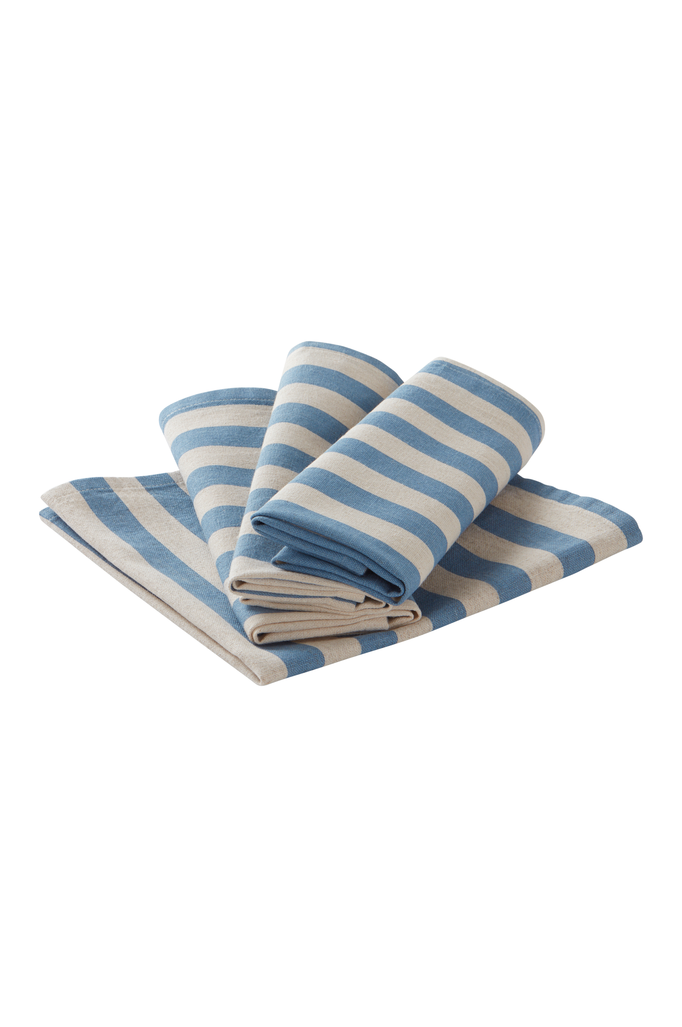 Een set van vier servetten van katoenmix waarin linnen is verwerkt wat de stof stevigheid geeft. De servetten hebben een geprint streepdessin met een frisse, klassieke uitstraling.
