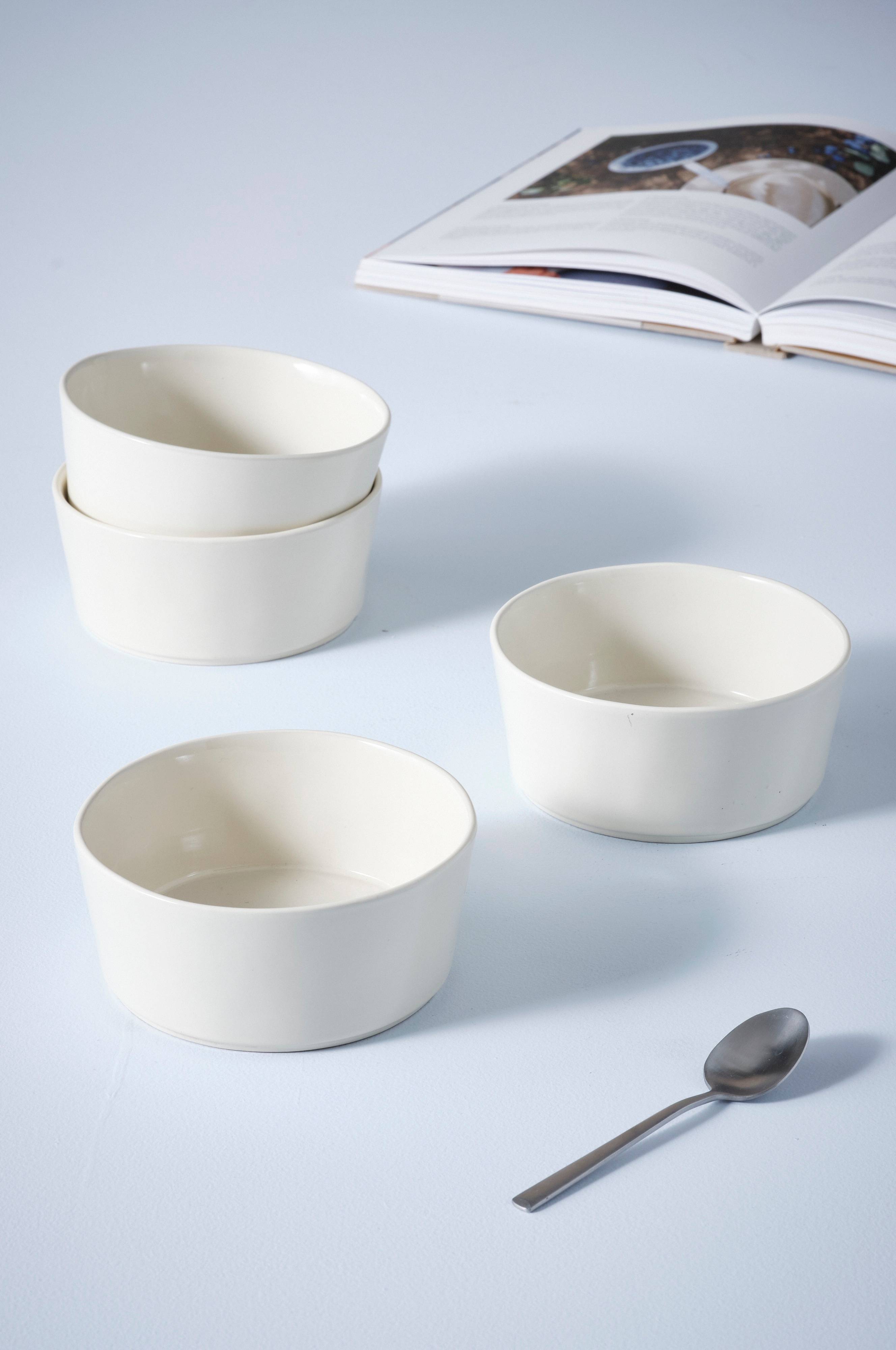 Een set van vier schaaltjes van aardewerk. De ALORA handgemaakte schaaltjes hebben een modern design en geven je gedekte tafel een stijlvolle uitstraling.