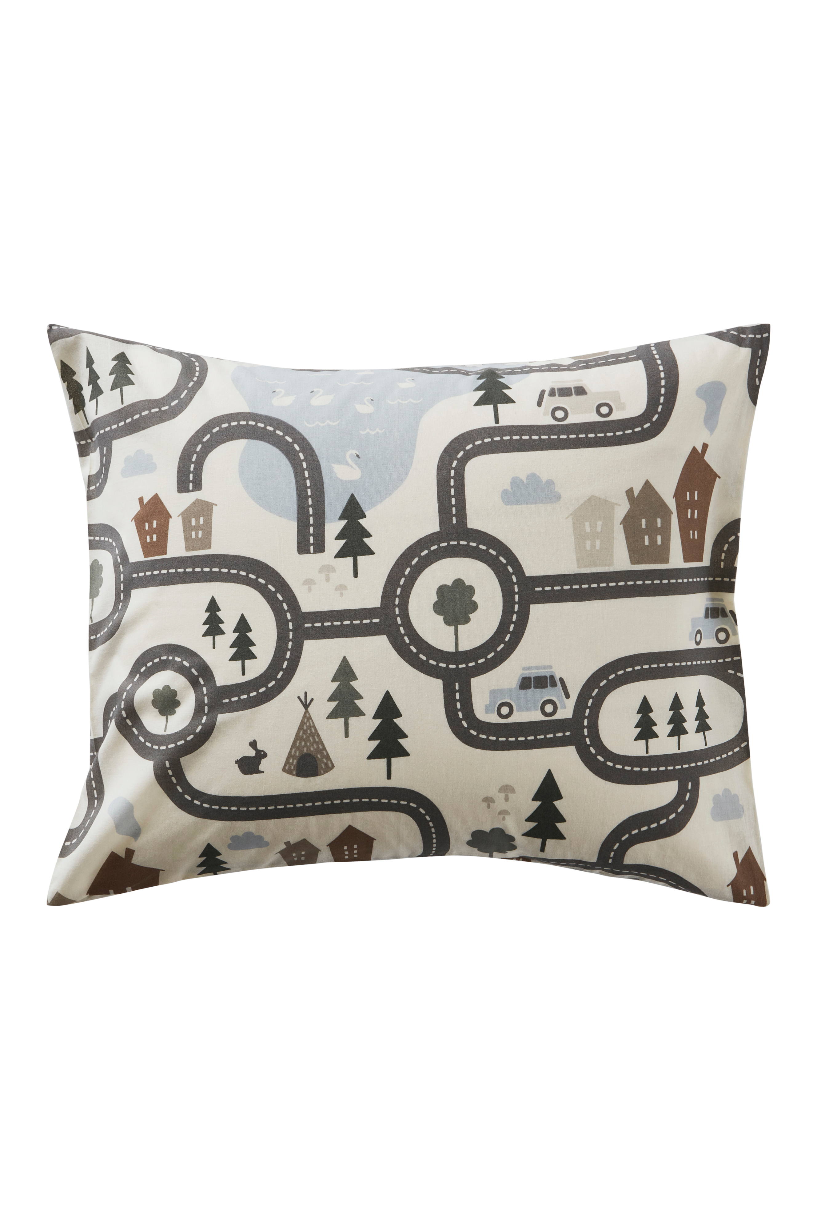 Een kussensloop van biologisch katoen met een geprint dessin in zachte, harmonieuze kleuren. Het motief is een drukke stad met wegen, huizen, dieren en natuur. Biologisch katoen is aangenaam om onder te slapen; het voelt koel en zacht aan. Draaddichtheid 144. (De draaddichtheid geeft het aantal draden aan per vierkante inch van een stof. Hoe hoger de draaddichtheid, hoe hoger de kwaliteit.)