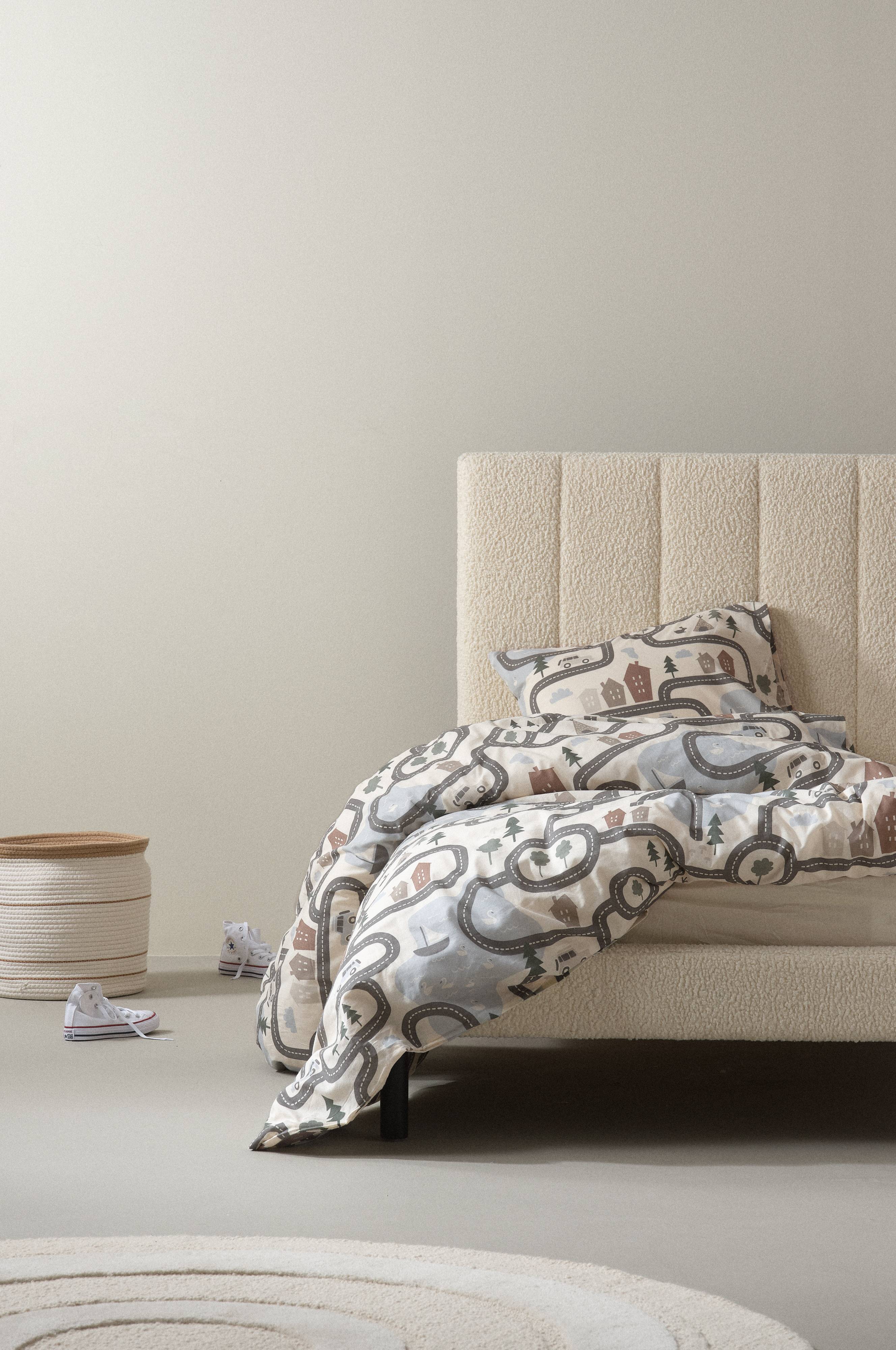 Een dekbedovertrek van biologisch katoen met een geprint dessin in zachte, harmonieuze kleuren. Het motief is een drukke stad met wegen, huizen, dieren en natuur. Biologisch katoen is aangenaam om onder te slapen; het voelt koel en zacht aan. Draaddichtheid 144. (De draaddichtheid geeft het aantal draden aan per vierkante inch van een stof. Hoe hoger de draaddichtheid, hoe hoger de kwaliteit.)