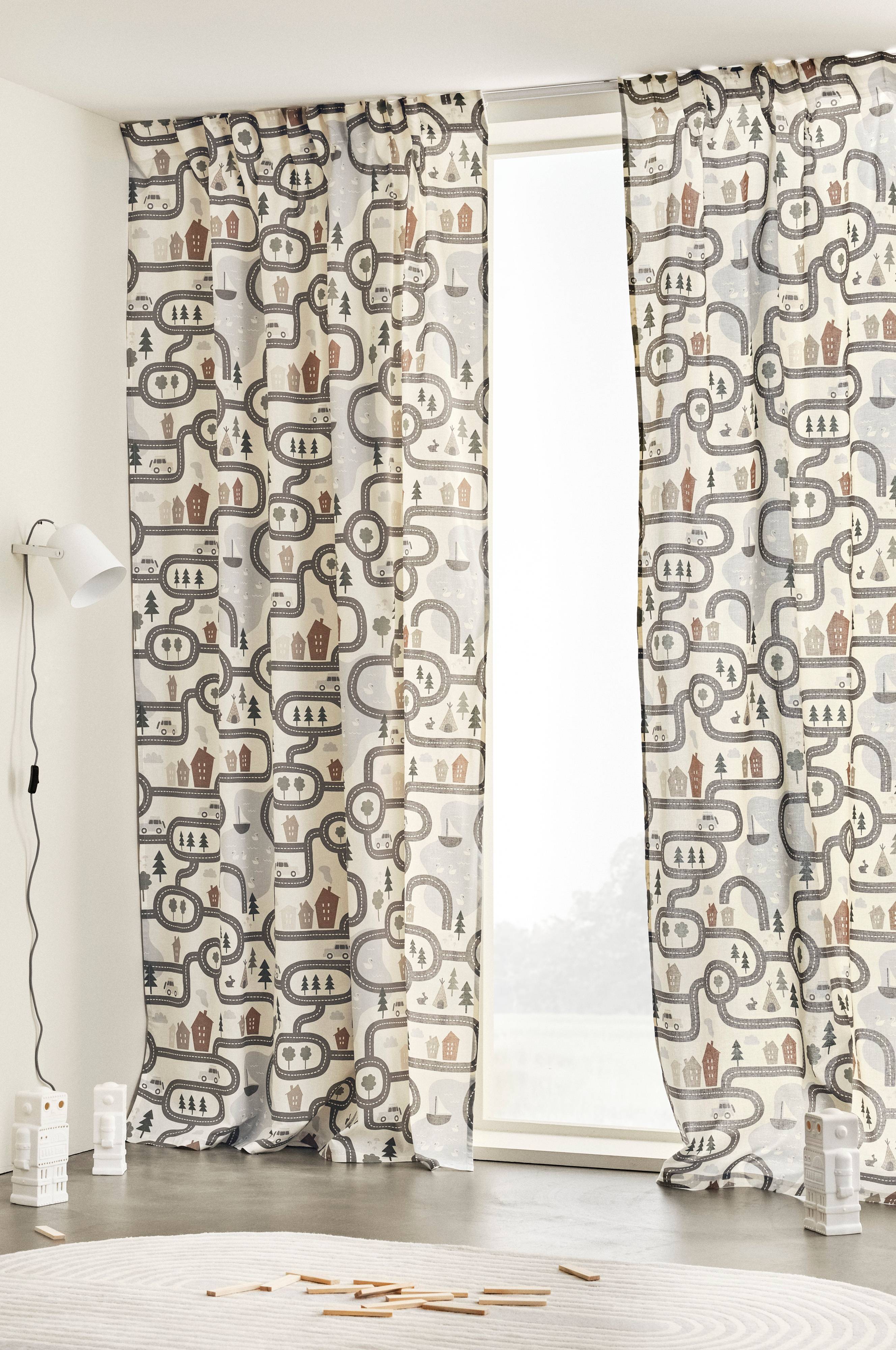 Twee gordijnen van biologisch katoen met een geprint dessin in zachte, harmonieuze kleuren. Het motief is een drukke stad met wegen, huizen, dieren en natuur. De gordijnen hebben een vastgestikt multifunctioneel gordijnband en kunnen met vingerhaken, roedetunnel of blinde lussen worden opgehangen.