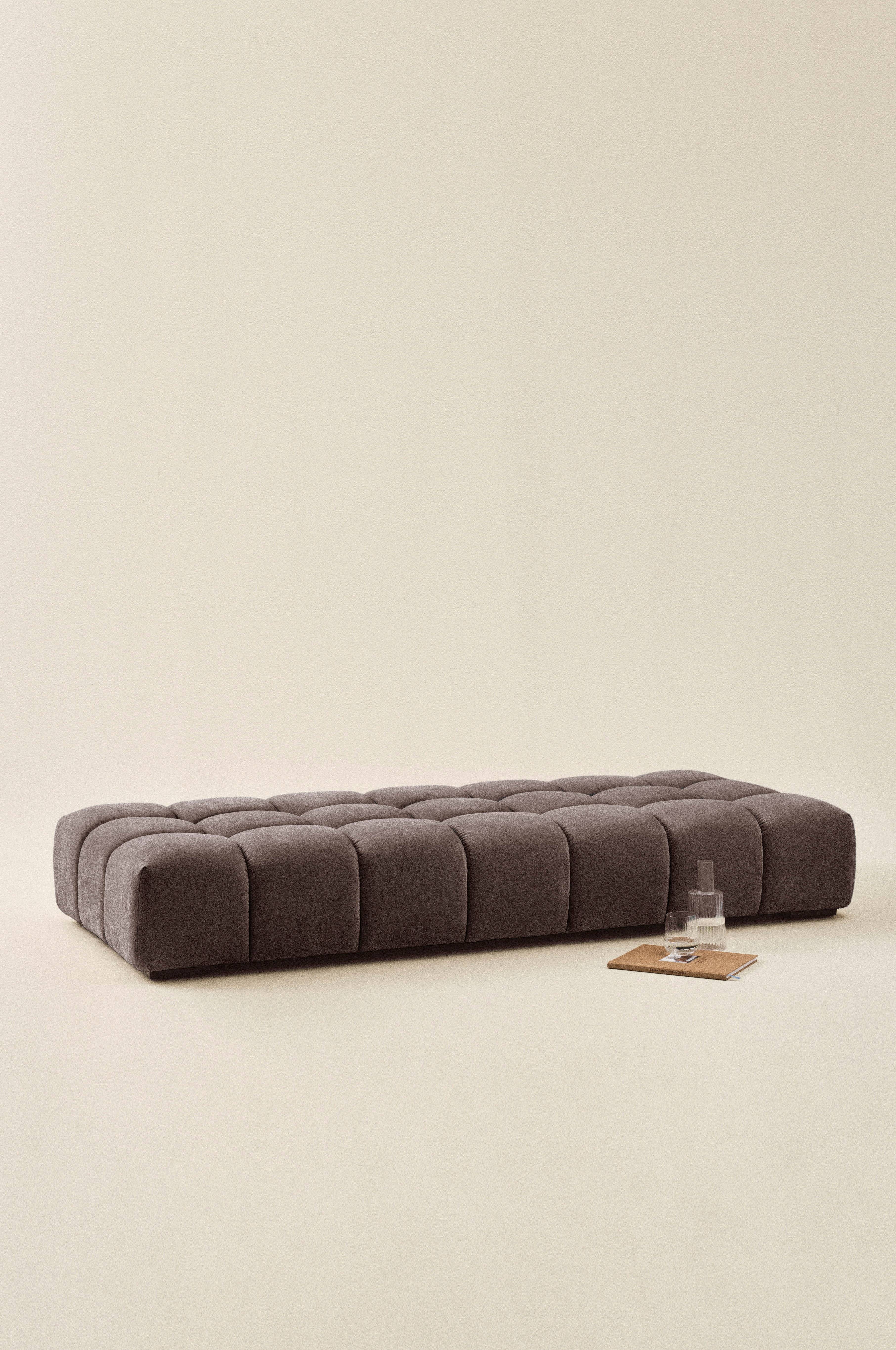 AMADO is een fantastisch groot daybed waarop je heerlijk kunt relaxen. De gebobbelde, uitnodigende vorm wordt gecreëerd door de comfortabele vulling en de bekleding van zacht chenille met doorgestikte naden over het hele daybed. De chenille stof is van polyester waarvan de helft afkomstig is van gerecycled materiaal. De stof heeft een slijtvastheid van 45.000 Martindale. De bekleding is niet afneembaar.