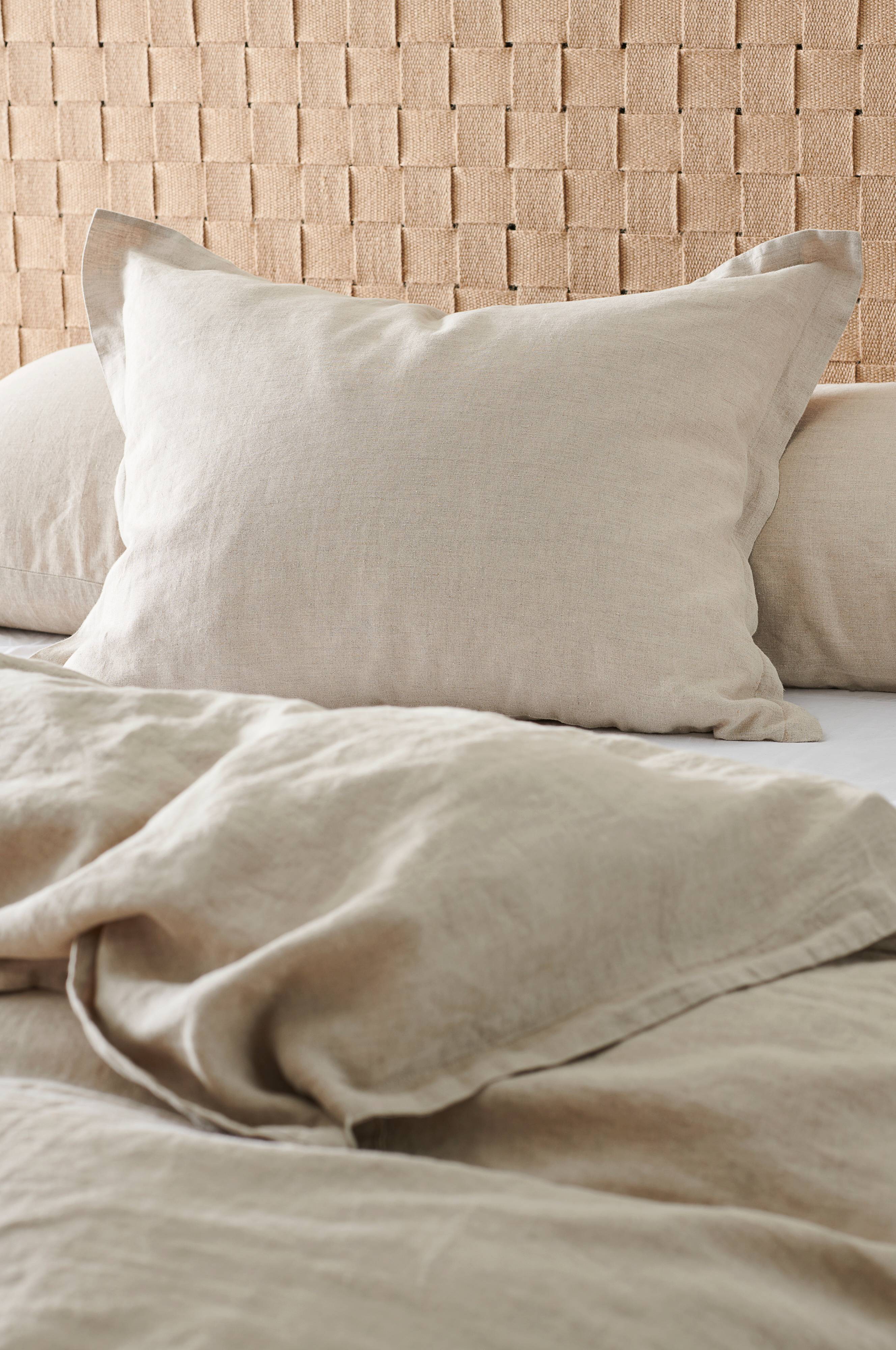 Een kussensloop van gewassen linnen. Het is niet moeilijk om voor de eigenschappen, het gevoel en de structuur van linnen te vallen. Linnen houdt je warm als het koud is en voelt koel aan als het warm is. Draaddichtheid 110. (De draaddichtheid geeft het aantal draden aan per vierkante inch van een stof. Hoe hoger de draaddichtheid, hoe hoger de kwaliteit. Met uitzondering van linnen, dat voor het juiste resultaat vaak losser geweven wordt.)