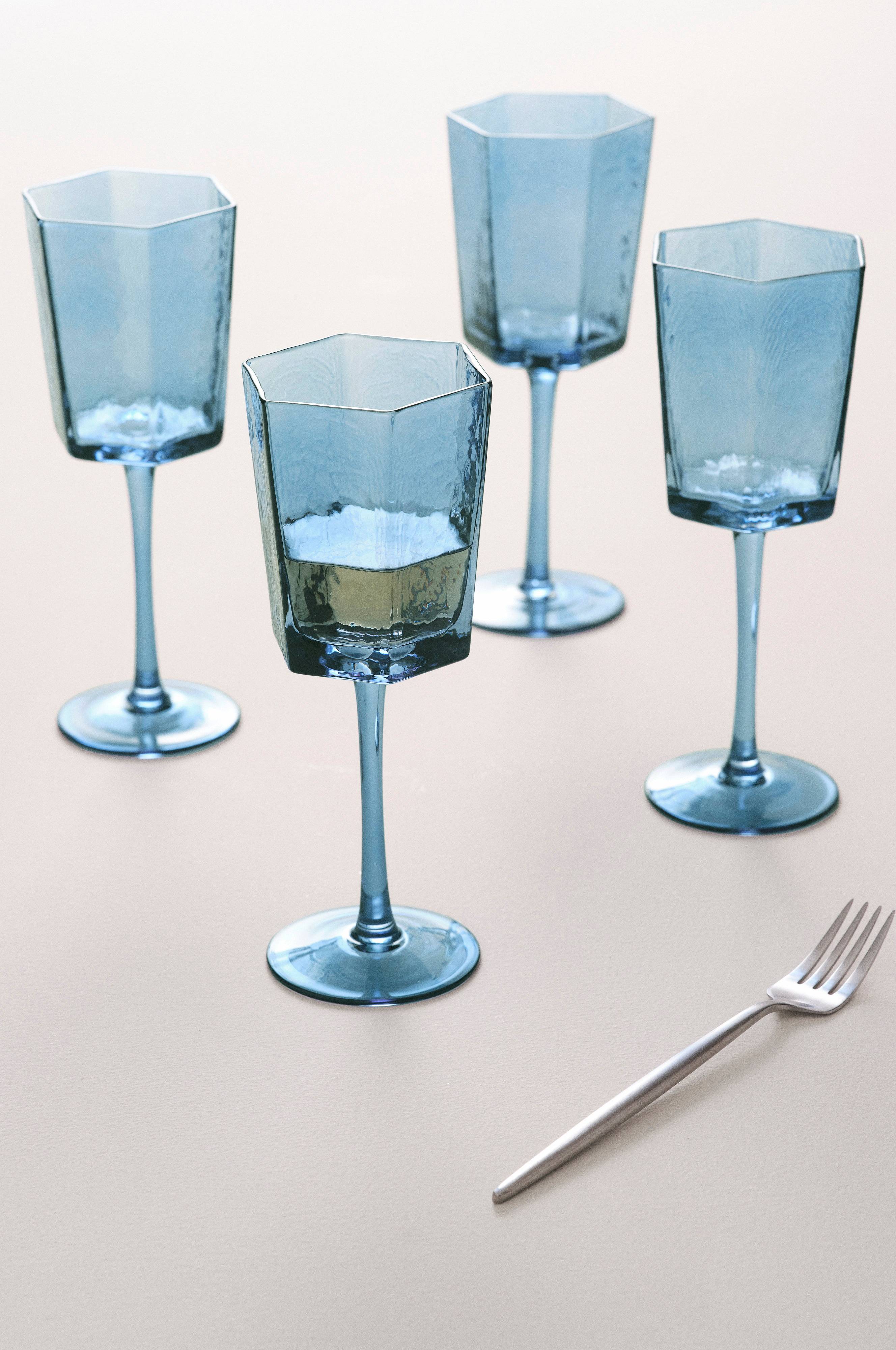 Een set van vier wijnglazen met een voet, van cadmiumvrij glas. De glazen uit de serie AMORY zijn zeshoekig en lopen naar onder mooi smal toe. Het glas in deze serie heeft een mooi onregelmatige structuur, waardoor je koude drankje extra dorstlessend lijkt. Het wijnglas uit de serie AMORY is geschikt voor witte en rode wijn en rosé. 35 cl per glas. Gewicht 278 gr.