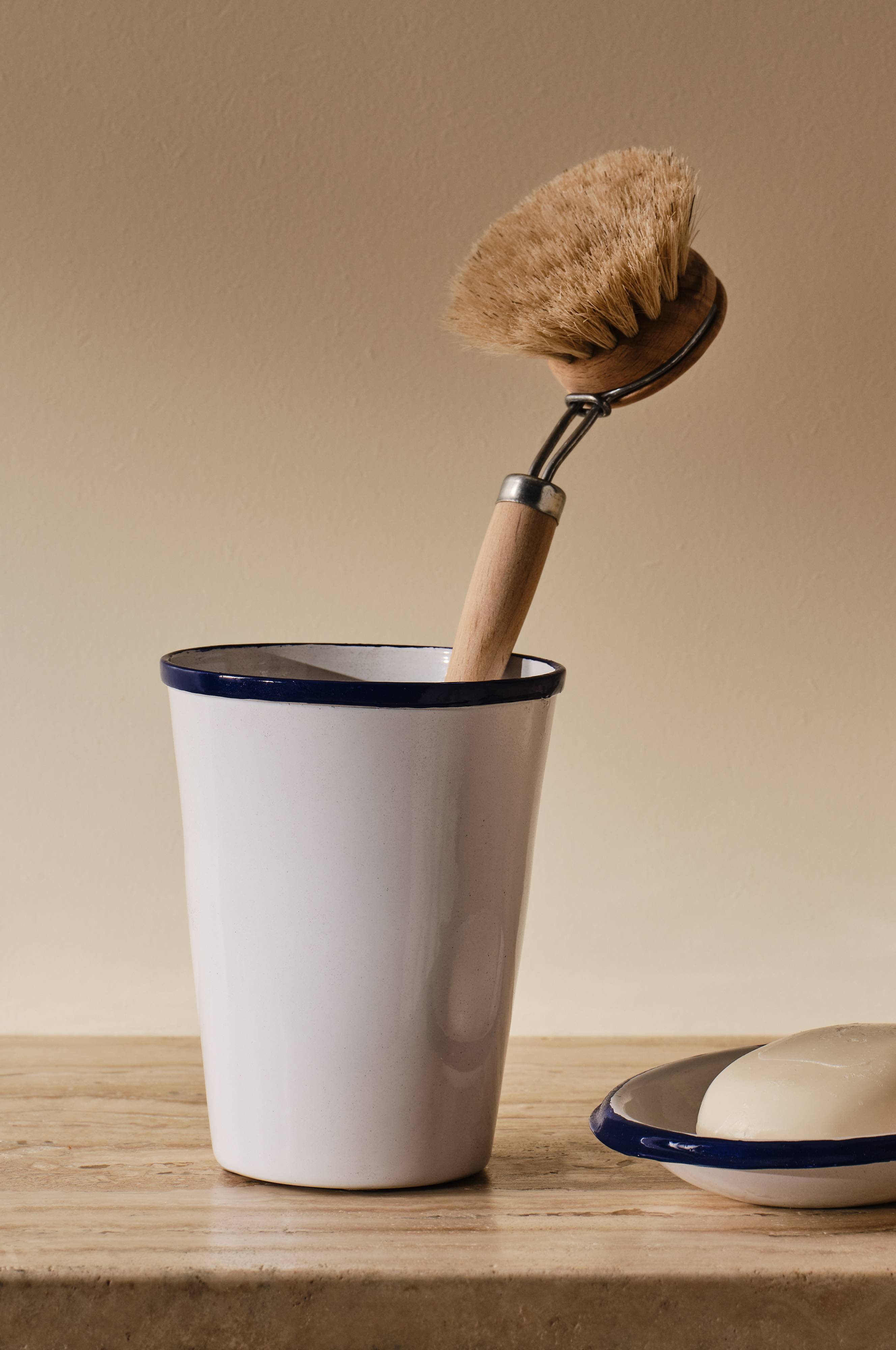Roestvrijstalen badkamermok met een helder, tijdloos ontwerp met een wit lichaam en een stijlvolle blauwe rand. Perfect voor het organiseren van je benodigdheden, voegt een chique touch toe aan je badkamerinrichting en combineert moderne esthetiek met praktisch gebruik.