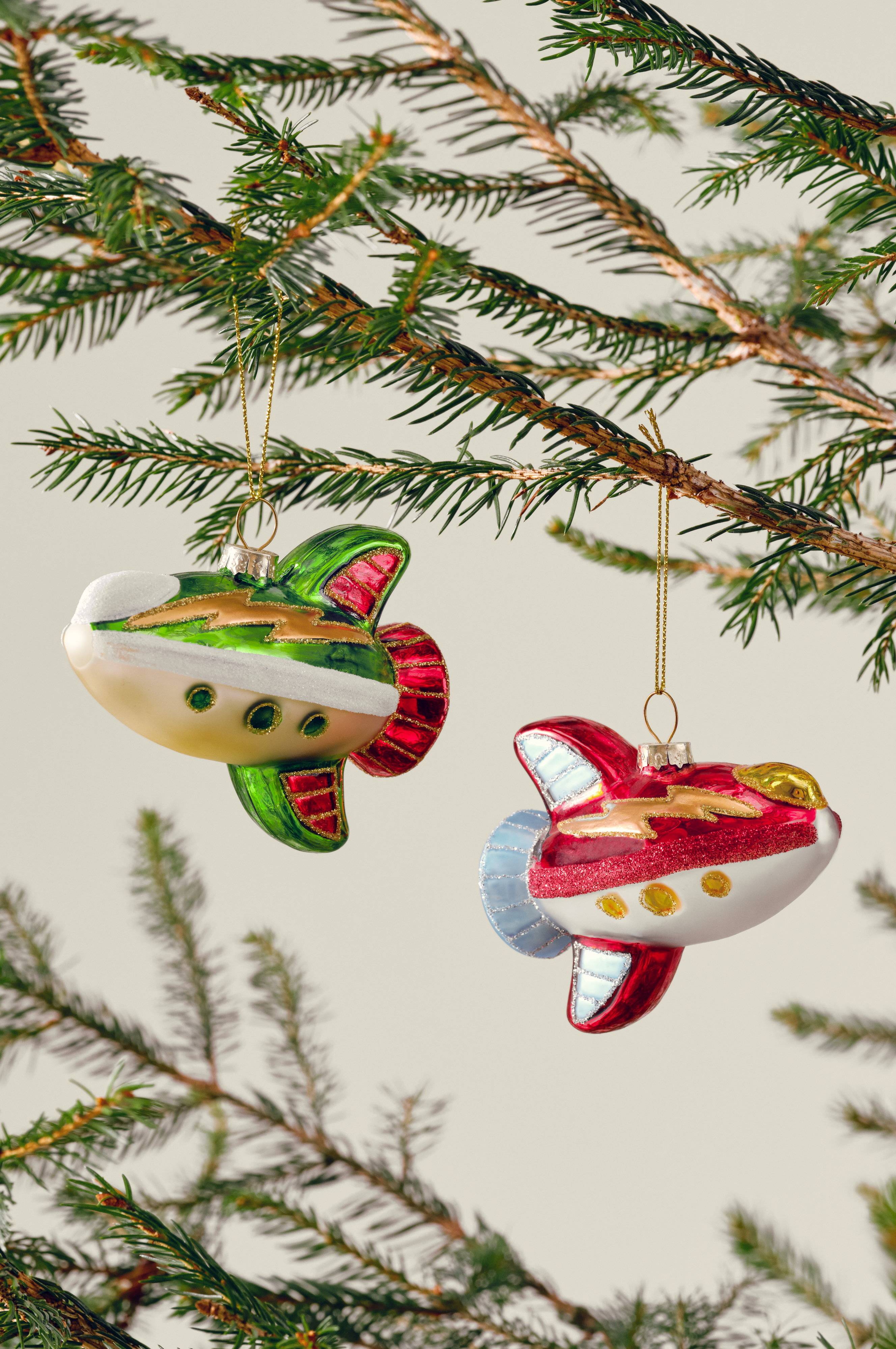 Decoratieve glazen vliegtuigjes ontworpen voor feestelijke kerstdecoratie of levendige kinderkamers. De APOLLO set bestaat uit twee rode en twee groene vliegtuigjes, ideaal voor ramen of kerstbomen.