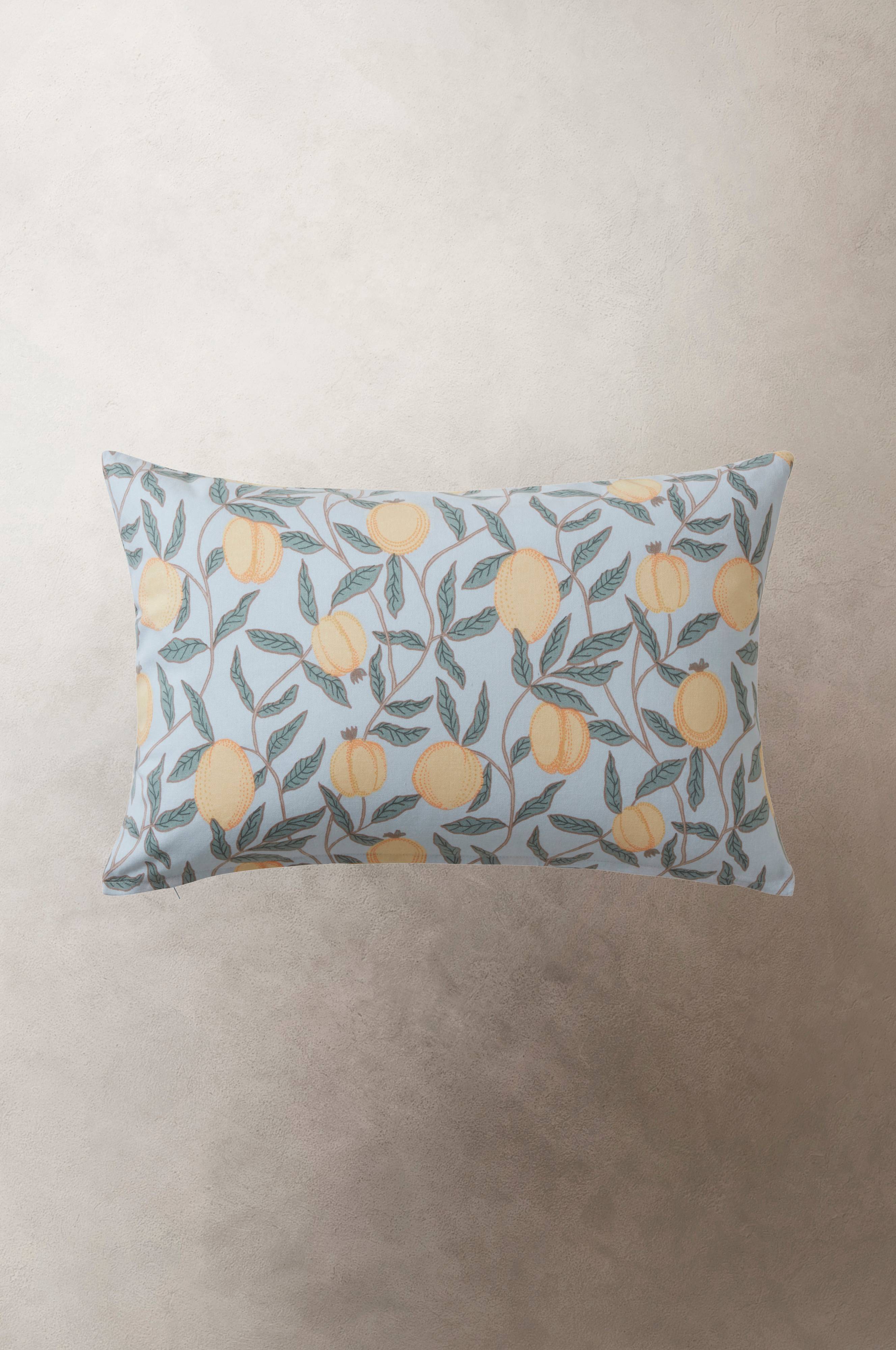 Een kussenhoes van katoenen halfpanama met een geprint dessin. De stof heeft een lichte ondergrond met een fris voorjaarsdessin van citrusfruit. Ritssluiting aan de onderkant.