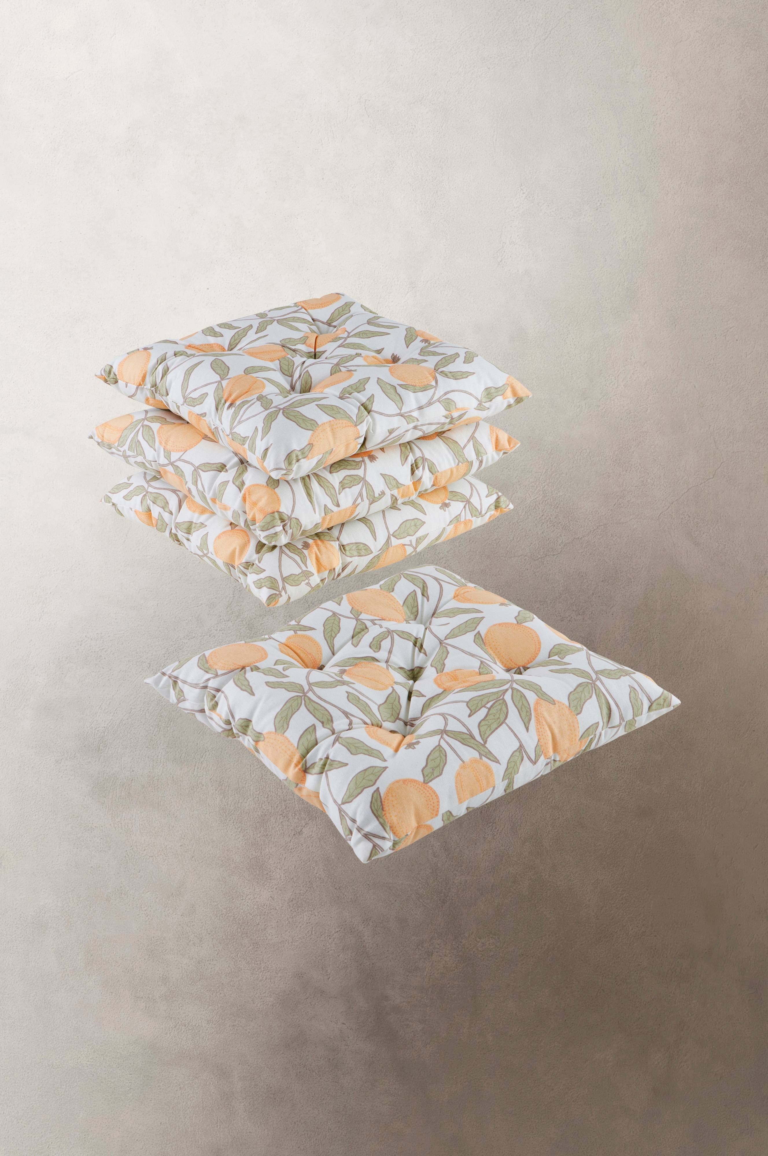 Een set van vier stoelkussens met een bekleding van katoenen halfpanama met een geprint dessin, een acrylaatcoating aan de onderzijde en een zachte vulling van polyester. De stof heeft een lichte ondergrond met een fris voorjaarsdessin van citrusfruit. De buitenkant van de stof is aangenaam mat en voelt aan als gewoon textiel. De acrylaatcoating maakt het stoelkussen praktisch, bestendig en waterafstotend.