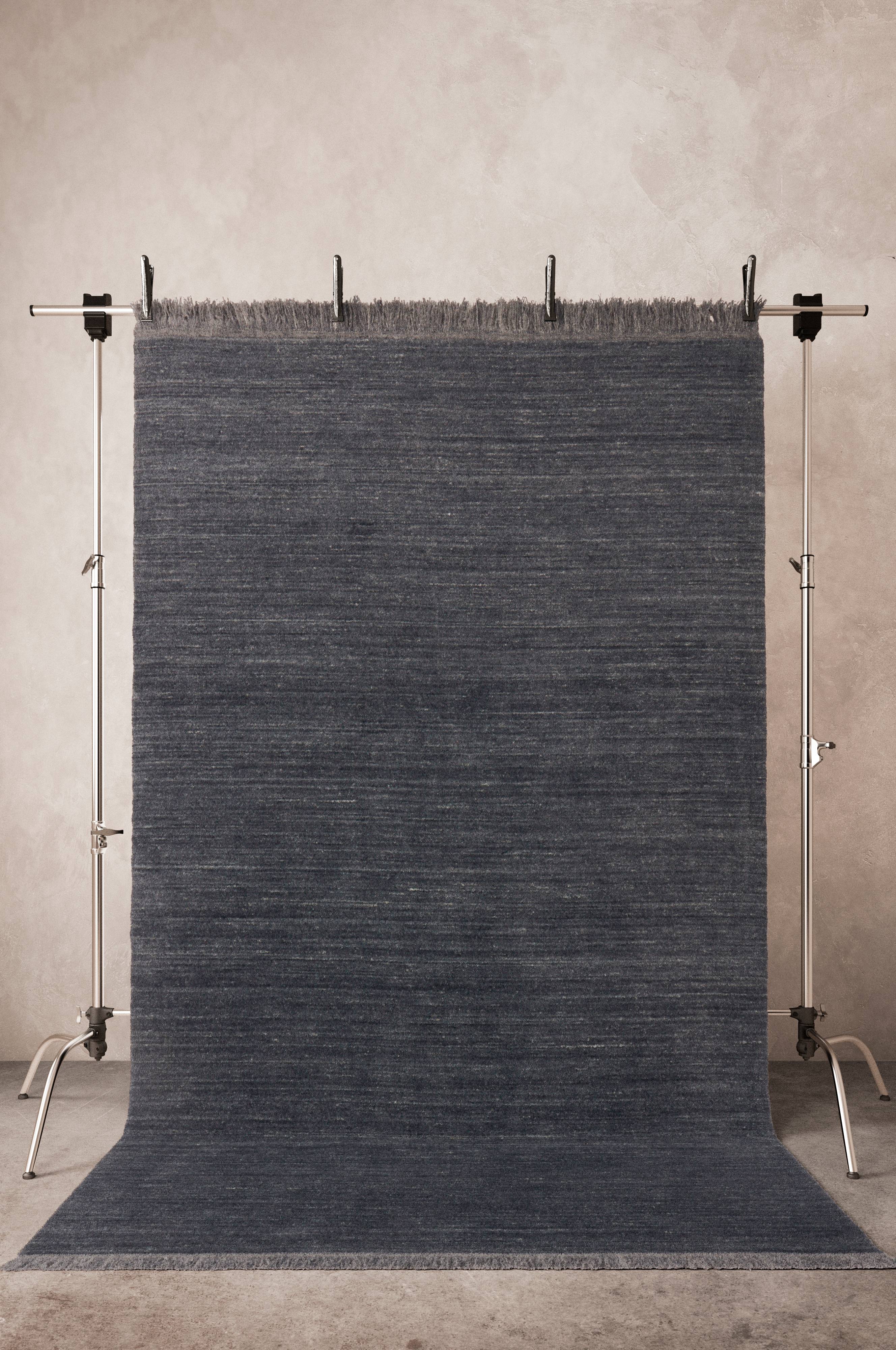 Een handgeknoopt vloerkleed van zachte wol met een beetje viscose. Het vloerkleed heeft een gemêleerd streepdessin in verschillende tinten en mooie franje aan de korte zijden. Lengte franje: 7,5 cm. Dikte: 18 mm. 3000 gr./m².