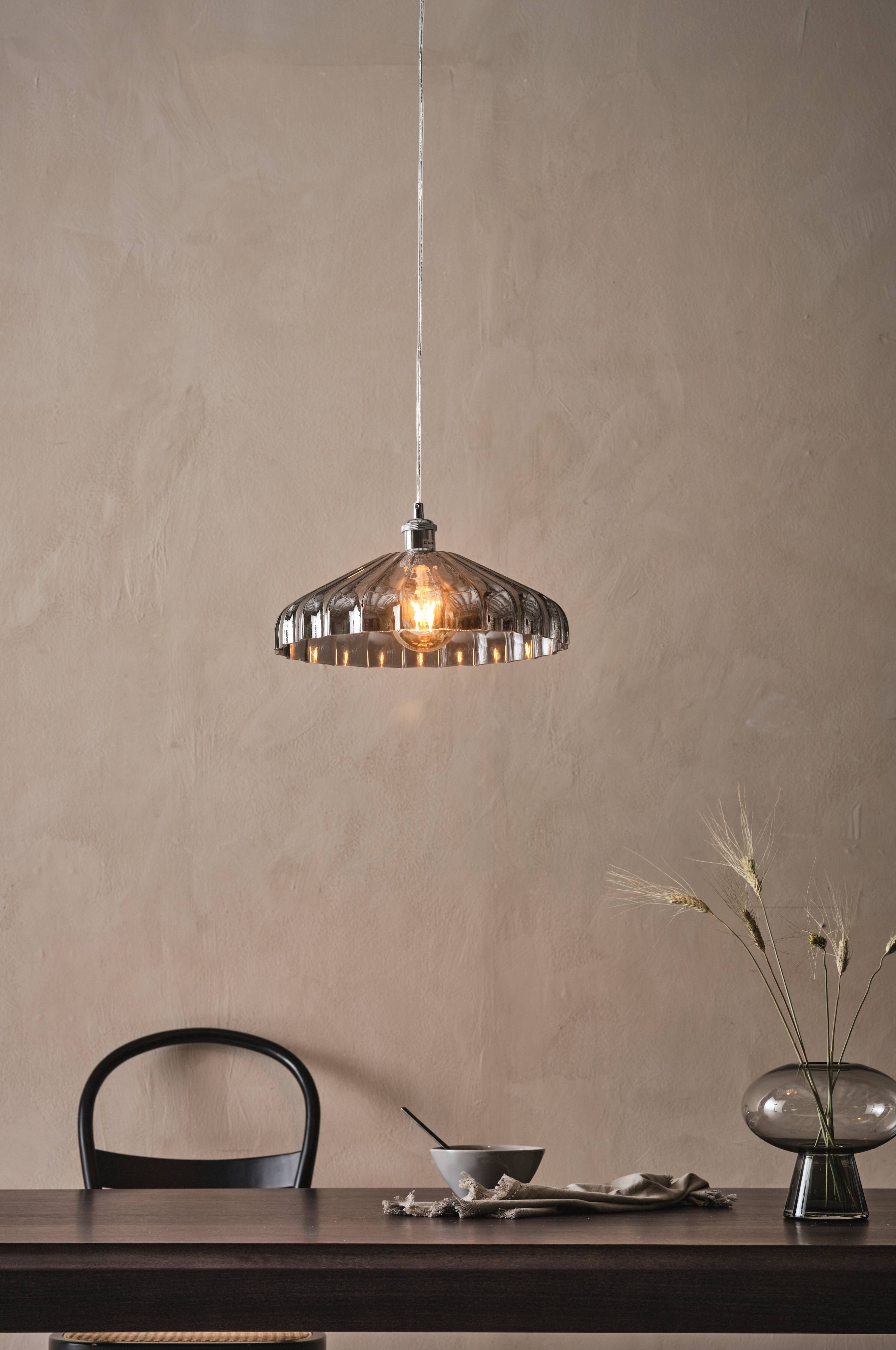 Een hanglamp met mooi vormgegeven bol van glas en bevestiging van metaal. Het glas is geribbeld en de lamp staat mooi boven de keukentafel of waarom niet boven een bank? Discreet, transparant kunststof snoer. De lamp is ongeaard, klasse 2. På grund av EU-regler behövs en separat takkontakt i vissa länder. Takkontakten ska vara ojordad (klass 2) och köps separat.