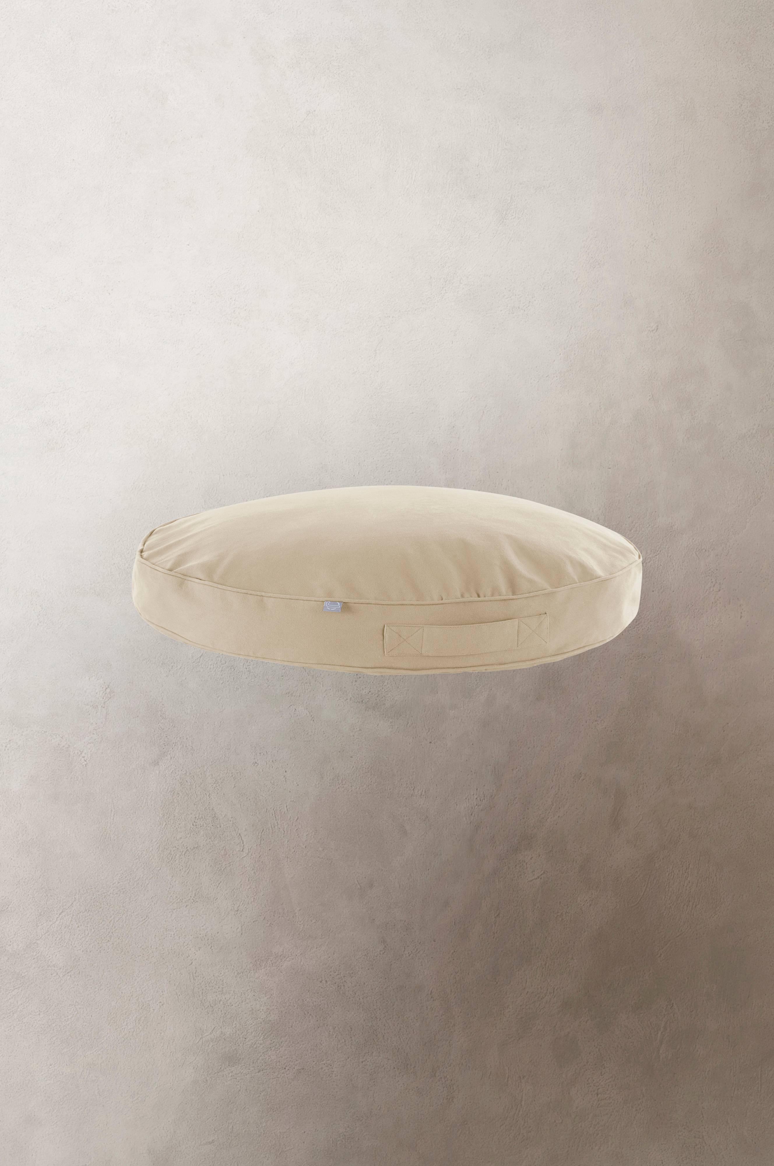 Eén ronde kussenhoes van katoenen canvas. De grote kussenhoes heeft een handgreep, bies rondom en een blinde rits aan de achterzijde. ATTILO is te gebruiken als heerlijk zitkussen, perfect voor kinderen die op de grond willen spelen. Eenvoudig mee te nemen dankzij het handvat.