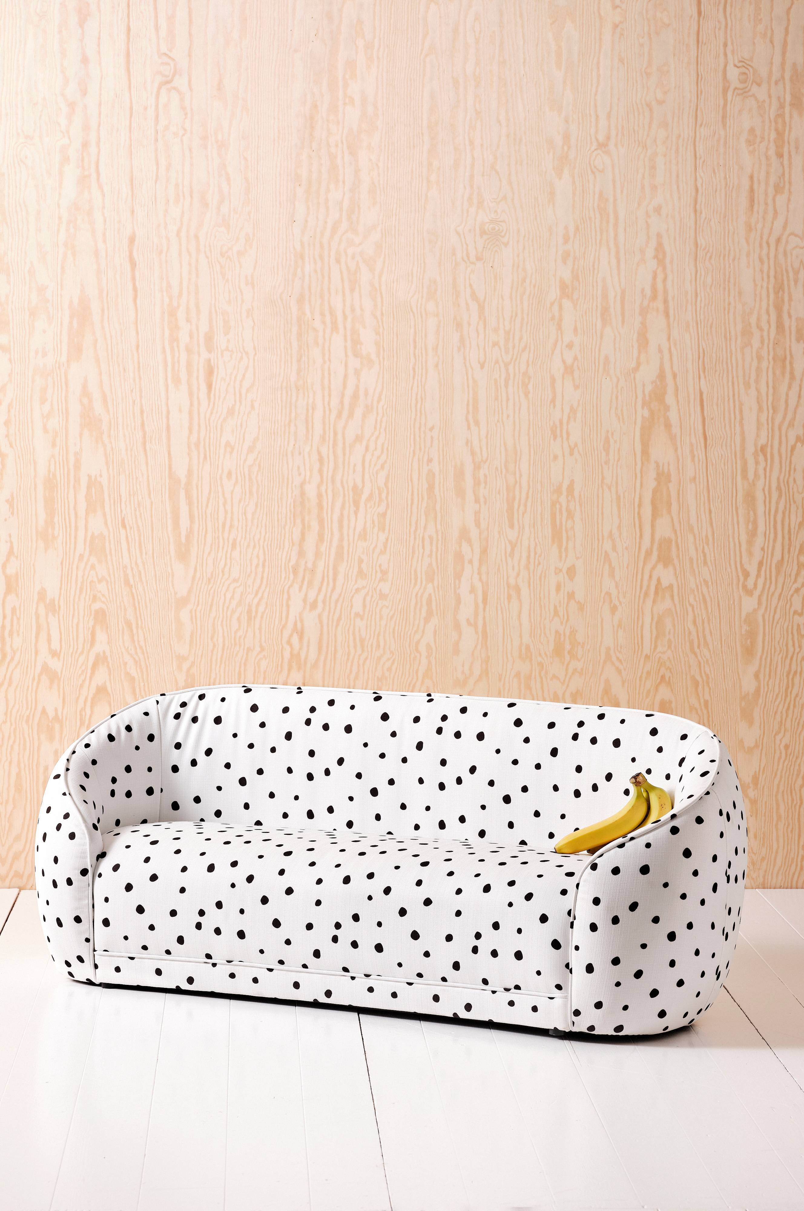 Een minizitbank met ronde vormen voor kinderen, bekleed met een polyesterstof met speelse stippen en met een stevig frame van grenen en multiplex. Deze bank heeft een uitstekend zitcomfort dankzij het koudschuim, de zigzagvering en de binnenveringskern. De stof heeft een zeer hoge slijtvastheid van 100.000 Martindale.