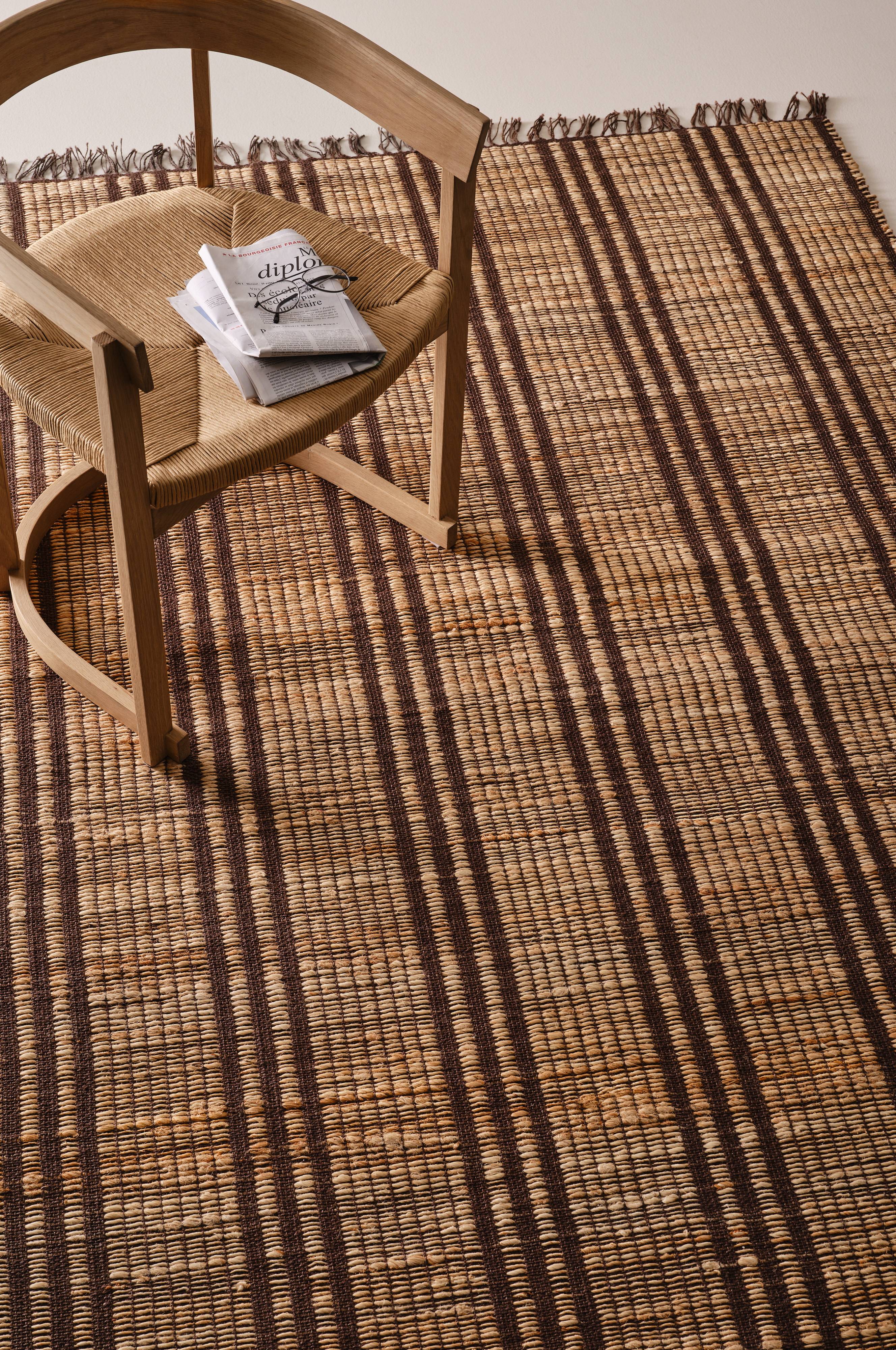 Een handgeweven loper van naturel jute met ingeweven zwarte strepen en zwarte franje. Jute is een rustiek natuurlijk materiaal dat voor een prettig relaxed gevoel zorgt. Dit vloerkleed heeft een onderkant van vilt wat het zachtheid en stevigheid geeft. Een handgemaakt vloerkleed is een prachtig stuk handwerk waardoor elk vloerkleed uniek is. Het langwerpige vloerkleed is perfect voor in de gang of het washok. Dikte 1 cm. 2200 gr./m².