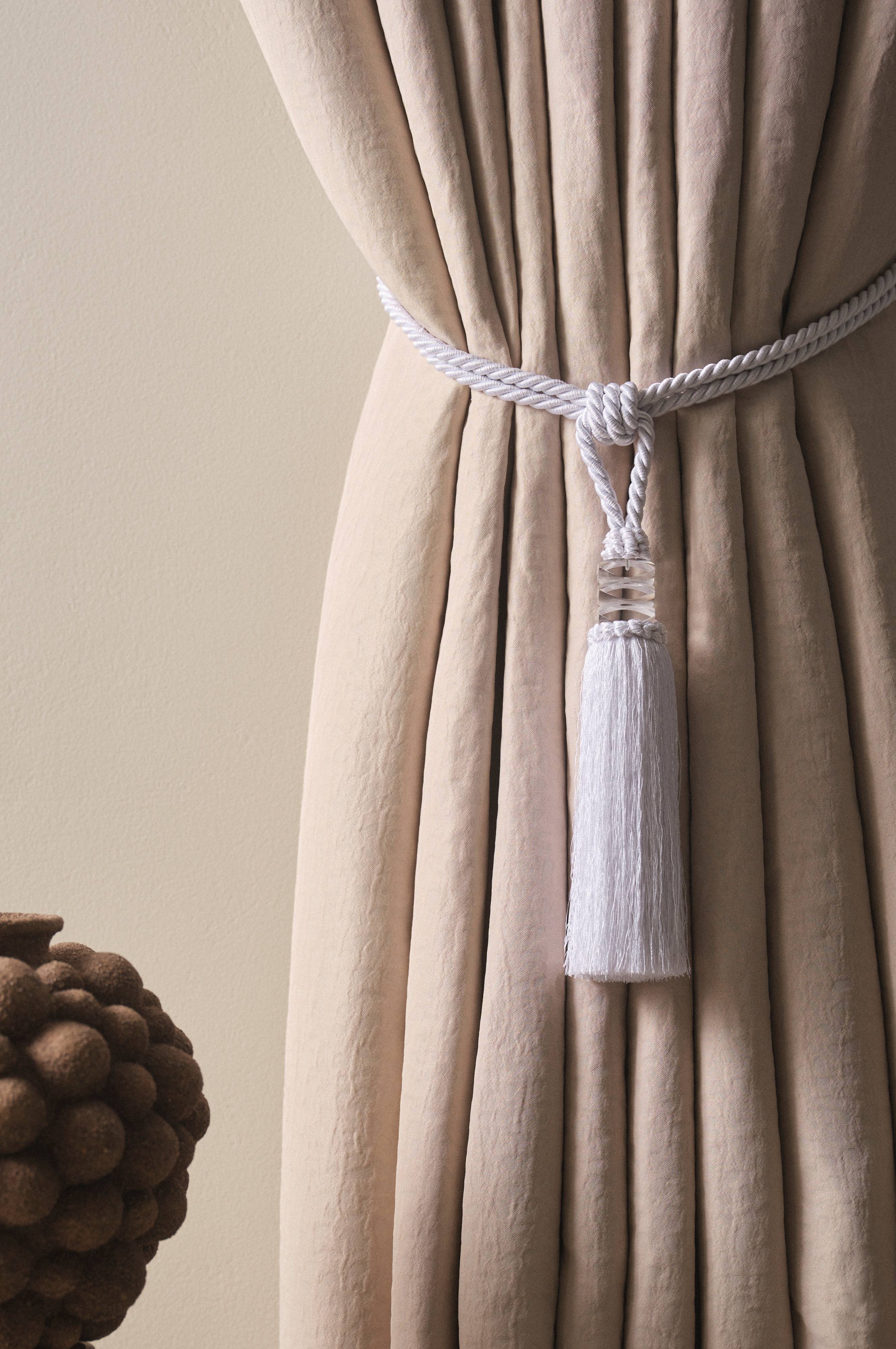 Een set van twee embrasses van polyester. AYA heeft een grote kwast met een decoratie van transparant acrylglas tussen de kwast en de embrasse zelf.