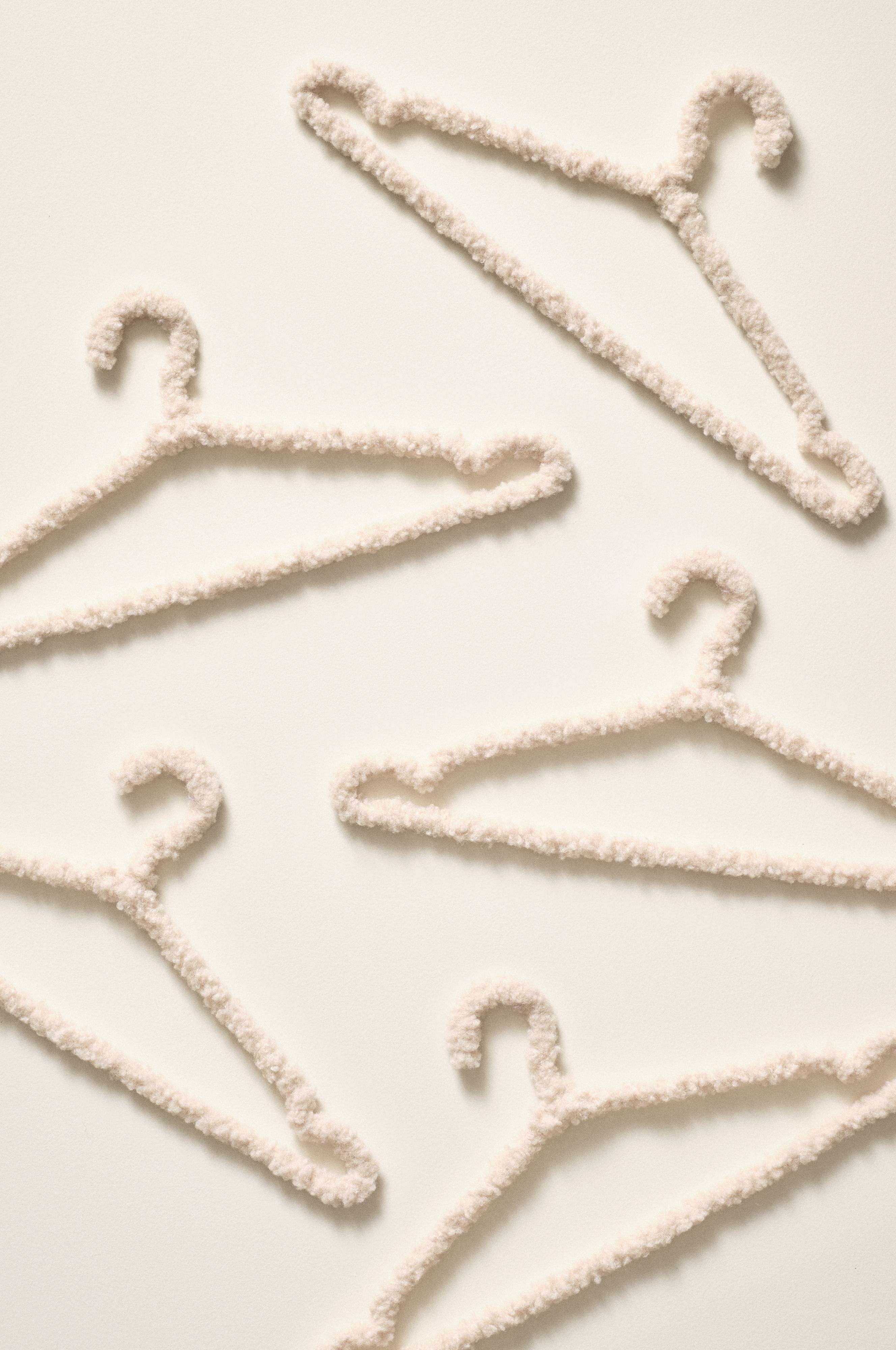 Een set van vijf kleerhangers van rvs, bekleed met zacht en heerlijk teddy van polyester. De kleerhangers zijn mooi om aan de kapstok in de hal of aan een kledingrek in de slaapkamer te hangen.