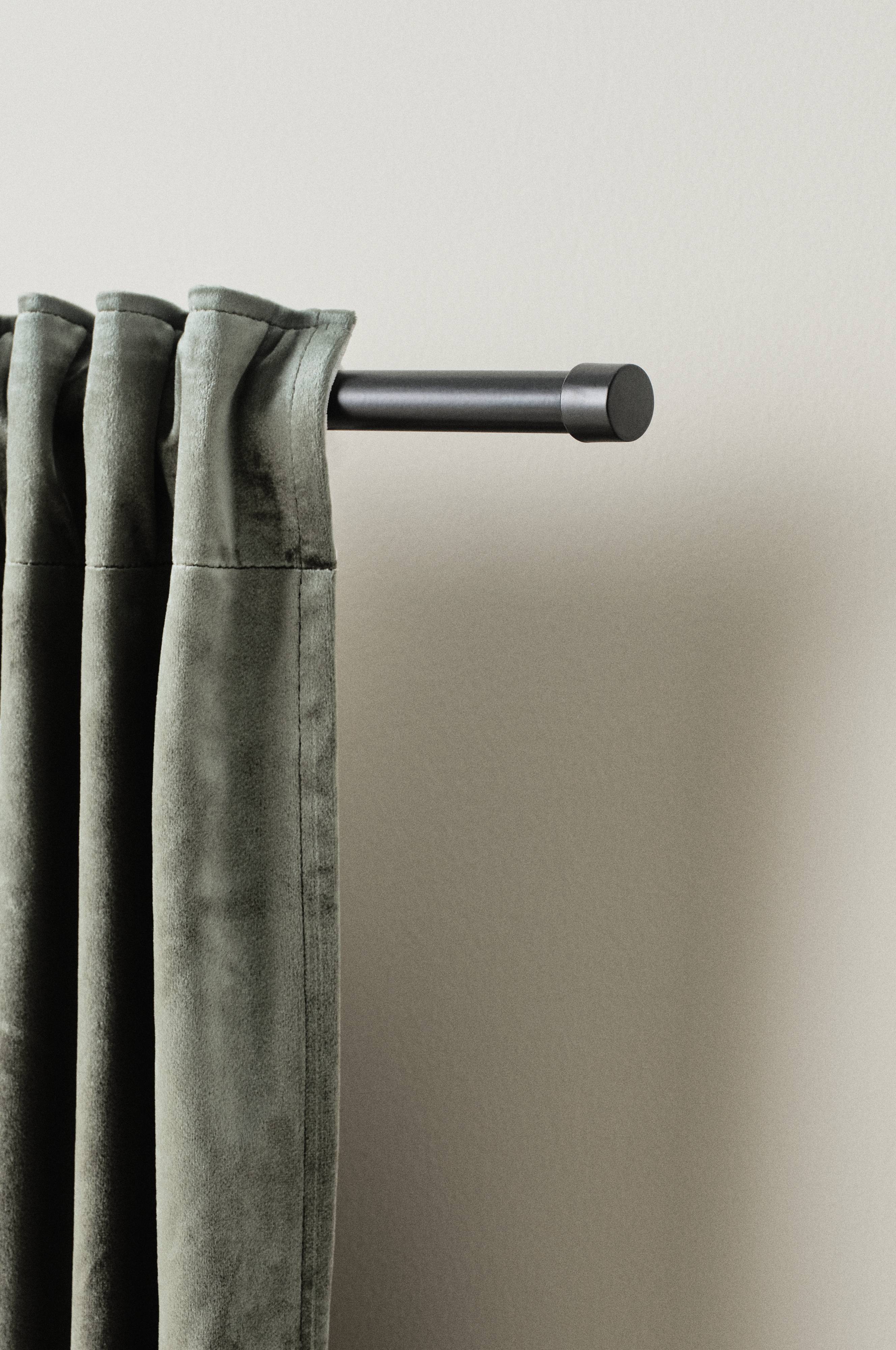 Een gordijnroede van aluminium met sierknoppen van metaal. Inclusief wandbevestigingen, schroeven en pluggen. De sierknoppen worden aan de gordijnroede vastgedraaid. Let op: het soort ondergrond bepaalt welk type beslag gebruikt moet worden.