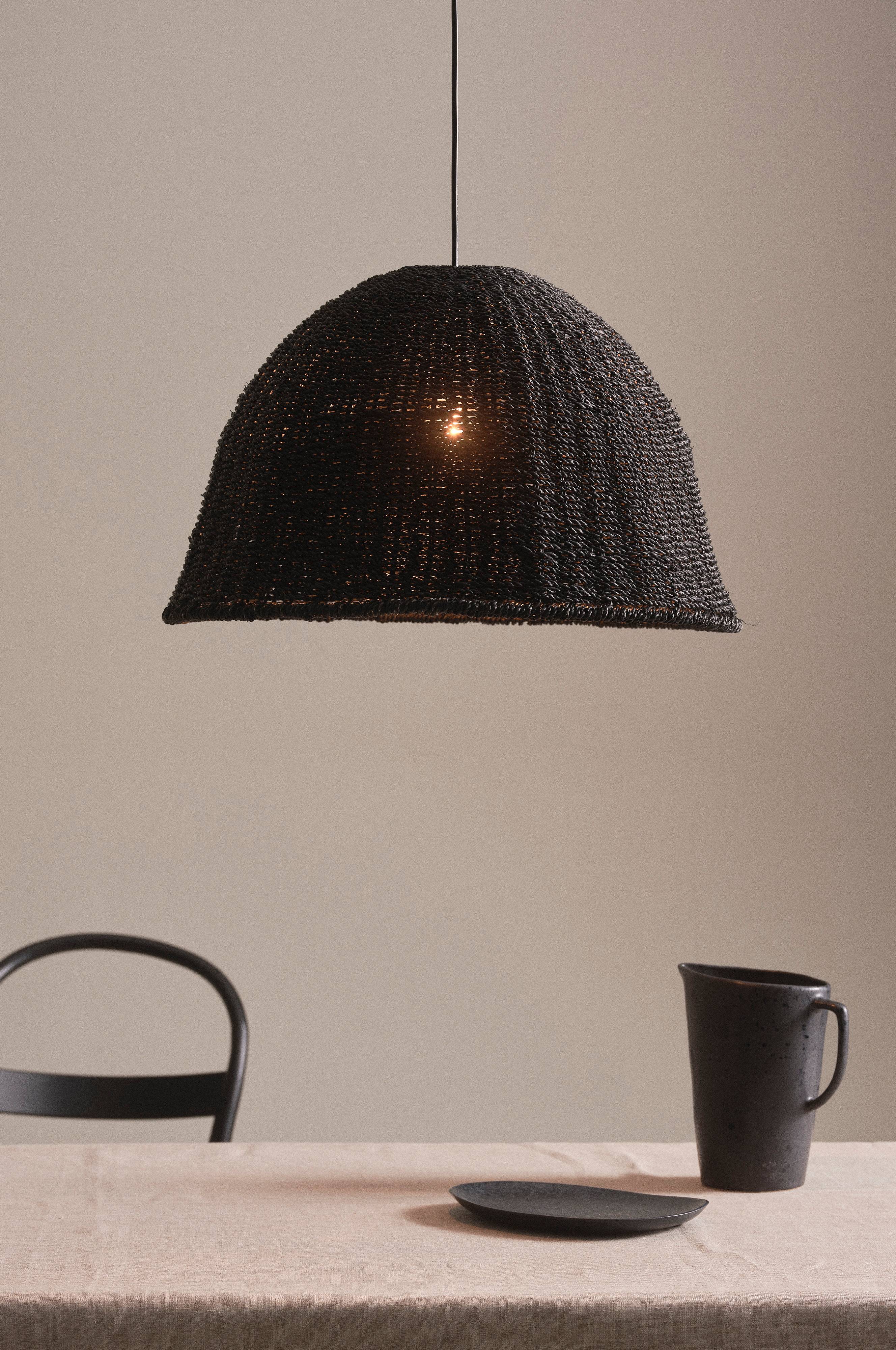 Een hanglamp van zwart jutekoord dat om een metalen frame is gevlochten. Deze sfeervolle lamp geeft met zijn natuurlijke look aangenaam licht. Jute is een natuurlijk materiaal met een rustieke uitstraling. Subtiel frame van metaal. Zwart snoer och kunststof plafondkap. Inclusief ophanghaakje. De lamp is ongeaard, klasse 2. Op grond van EU-regelgeving is er in sommige landen een losse plafondstekker nodig. De plafondstekker moet ongeaard zijn (klasse 2) en wordt los verkocht.