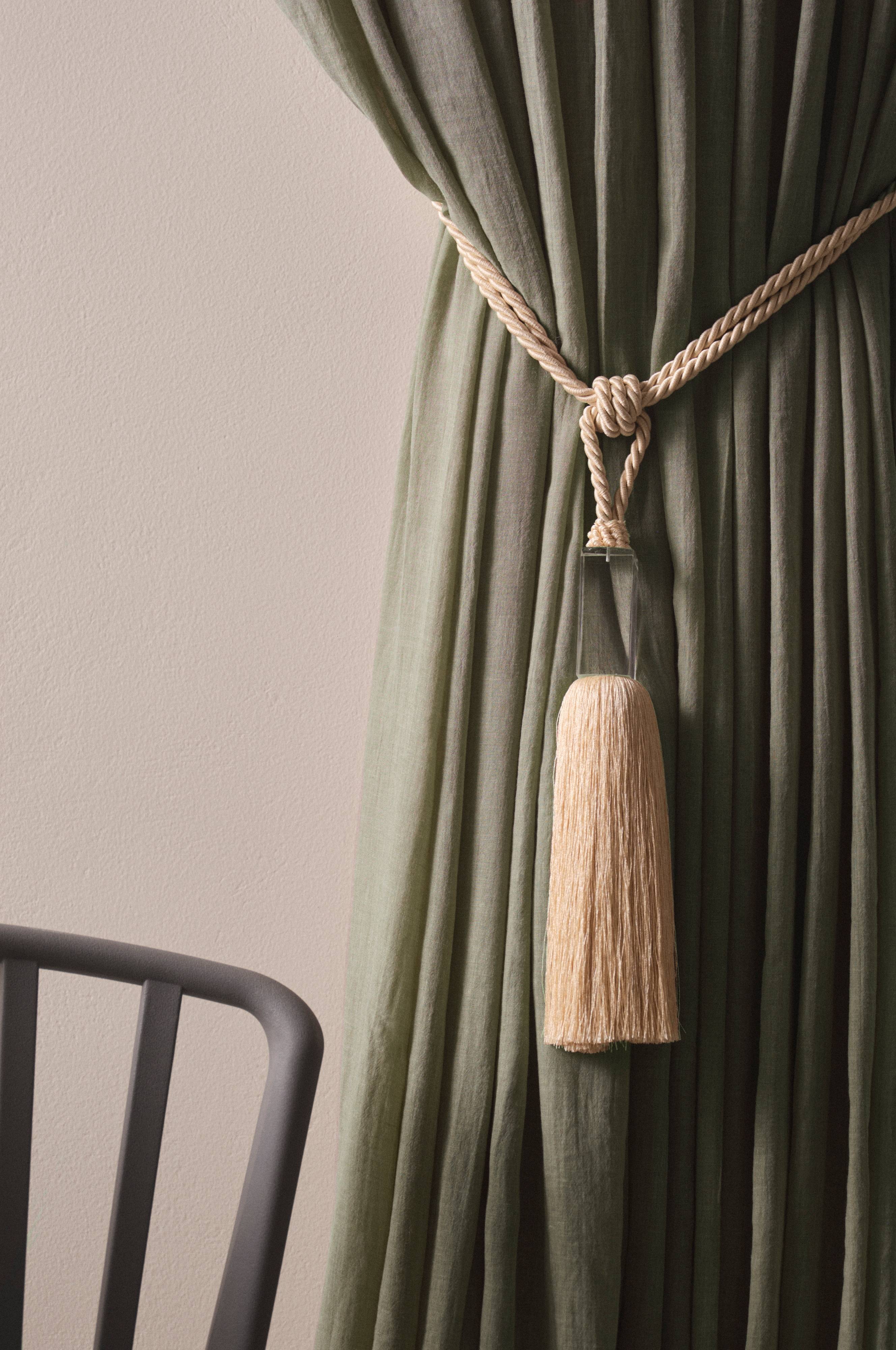 Een set van twee embrasses van polyester. BIBI heeft een groot kwastje met daarboven een decoratie van transparant acrylglas.