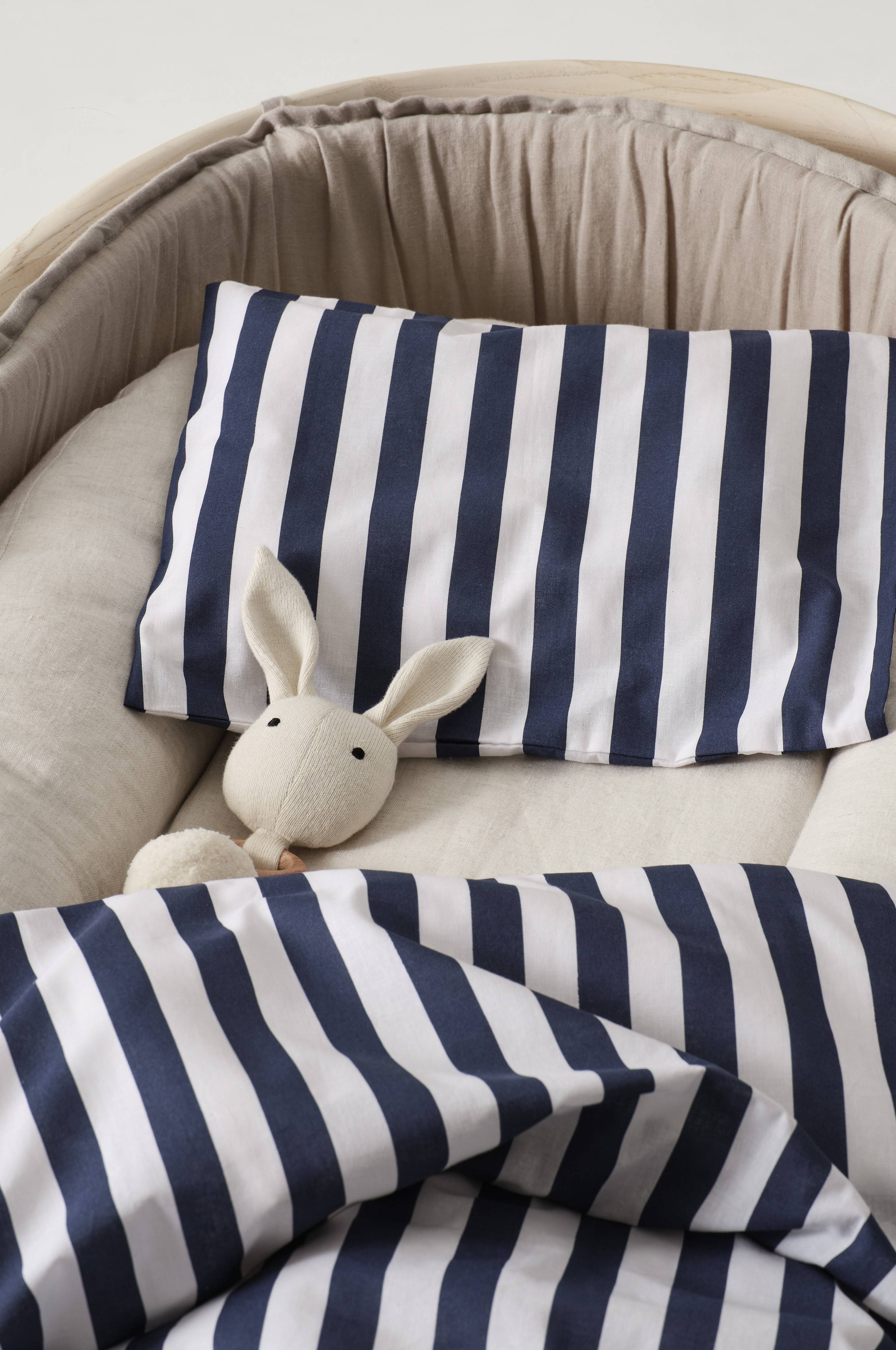 Een dekbedovertrekset met smalle strepen die bestaat uit een dekbedovertrek en een kussensloop van biologisch katoen. De set is geschikt voor een kinderwagen of een wieg. De stof heeft een fijne print, katoen voelt koel en aangenaam aan. Het strepenpatroon is geprint in heldere, vrolijke kleuren afgewisseld met een witte streep. De klassieke streep is altijd goed, zowel voor groot als klein. Draaddichtheid 144. (De draaddichtheid geeft het aantal draden aan per vierkante inch van een stof. Hoe hoger de draaddichtheid, hoe hoger de kwaliteit.)