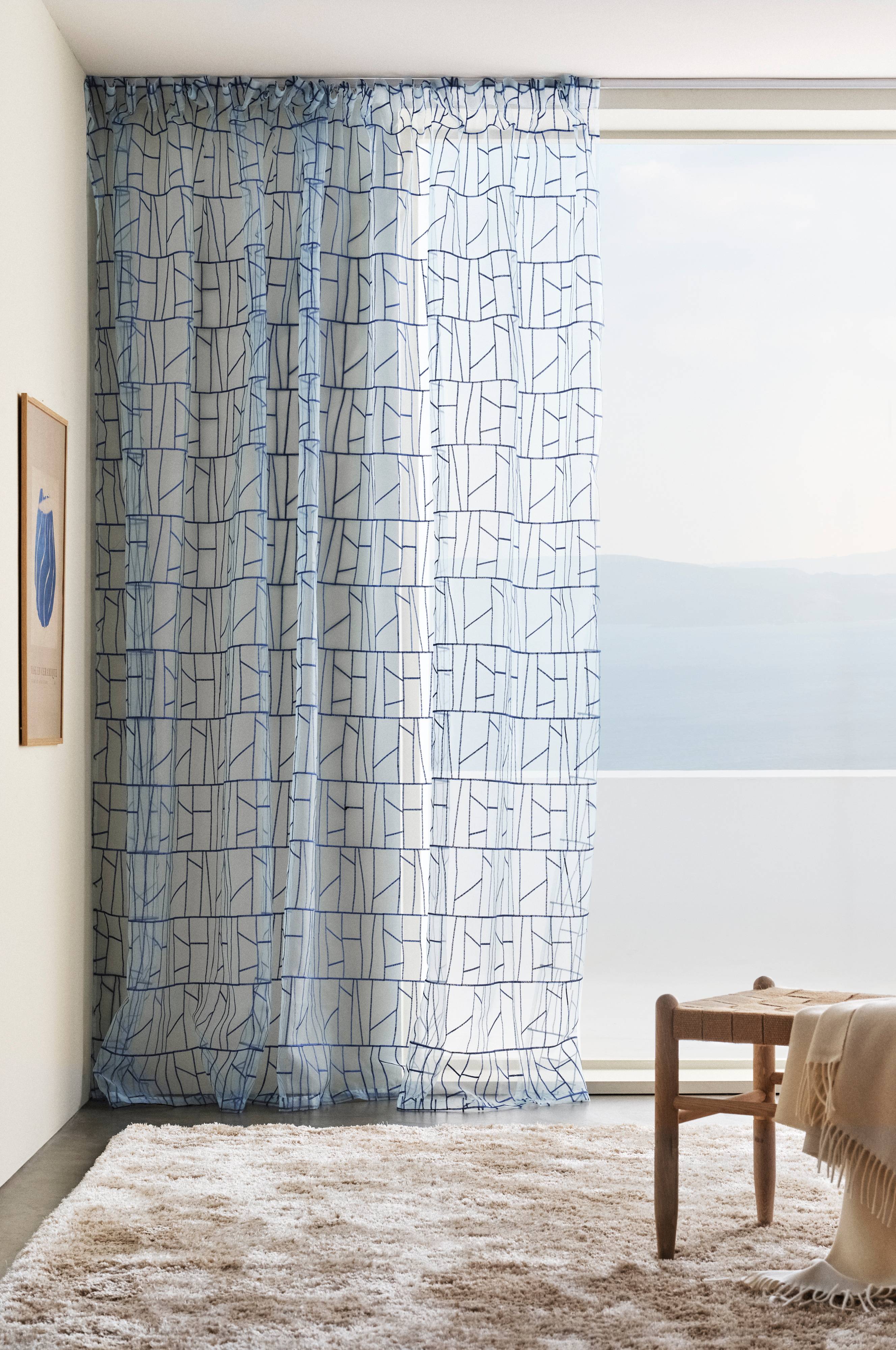 Eén gordijn van organza van polyester en polyamide met een geborduurd, onregelmatig netdessin. Het dessin is geïnspireerd op bojagi: een Koreaanse patchworktechniek. Het transparantie gordijn heeft vastgestikt multifunctioneel gordijnband en kan met vingerhaken, roedetunnel of blinde lussen worden opgehangen.