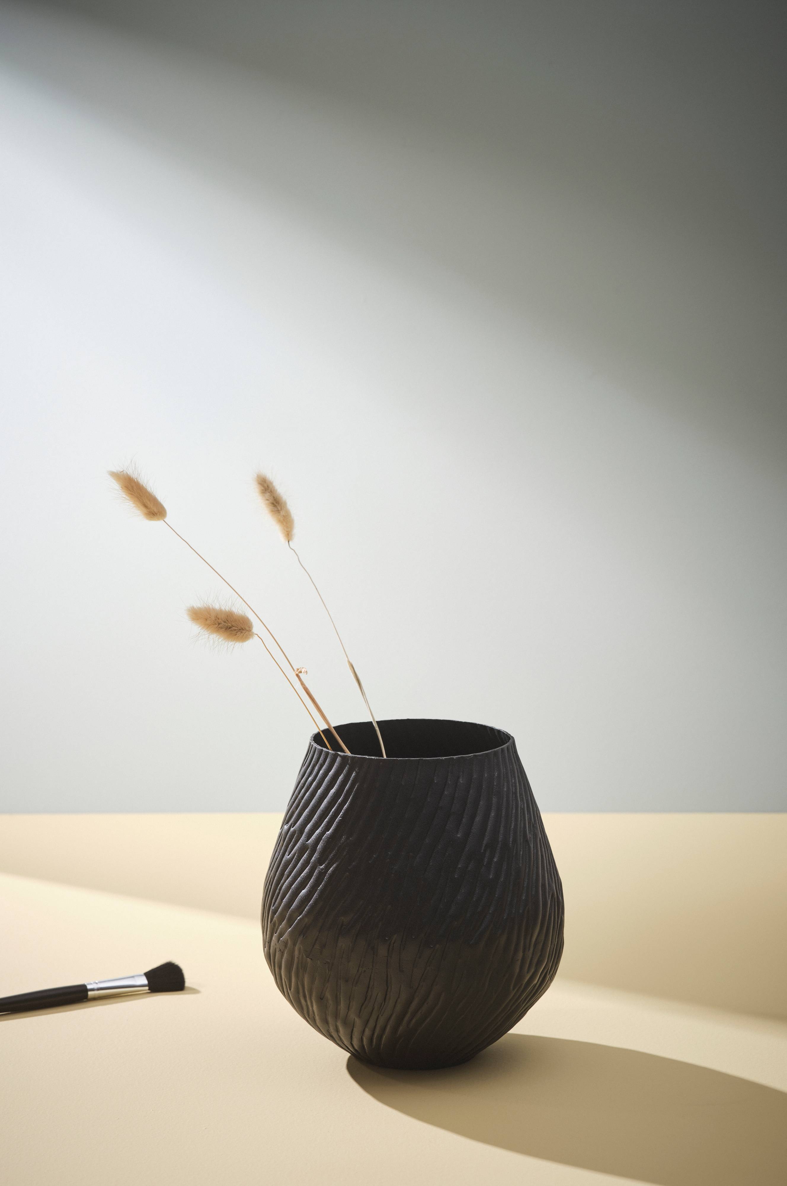 Een vaas van aluminium met een geribbelde structuur en een goudkleurige lak. De vaas heeft een mooie ronde vorm en is een mooie basis voor decoratieve bloemen of takken.