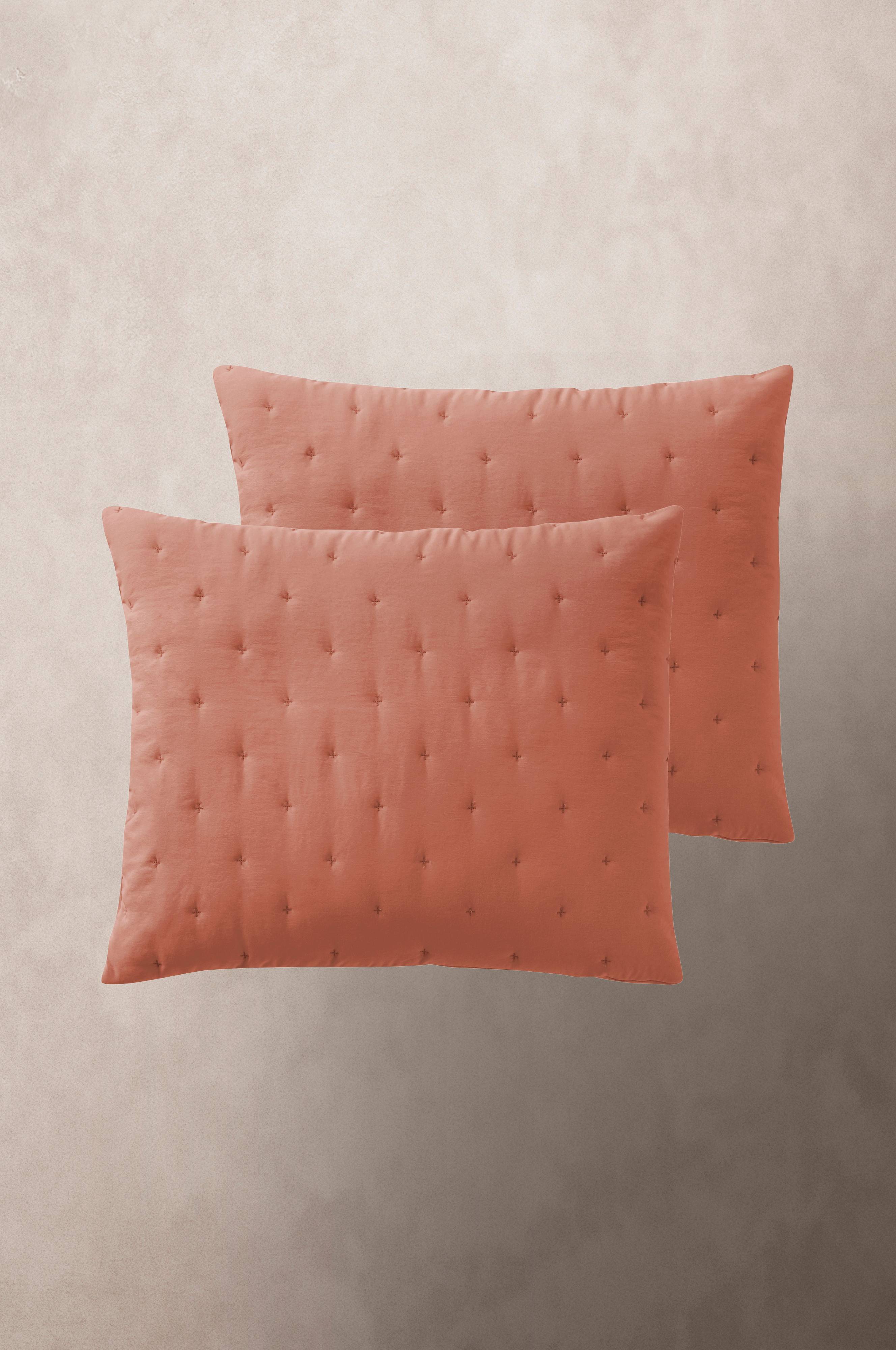 Twee kussenslopen, gemaakt van zacht polyester met een wassing waardoor de stof prettig aanvoelt. De kussenhoezen zijn voorzien van geborduurde, doorgestikte kruisjes die een subtiel, maar levendig dessin vormen op de voorzijde. De stof is heeft een lichte vulling die op haar plek wordt gehouden door het doorstikken. De achterkant is glad. Blinde ritssluiting aan de achterkant.