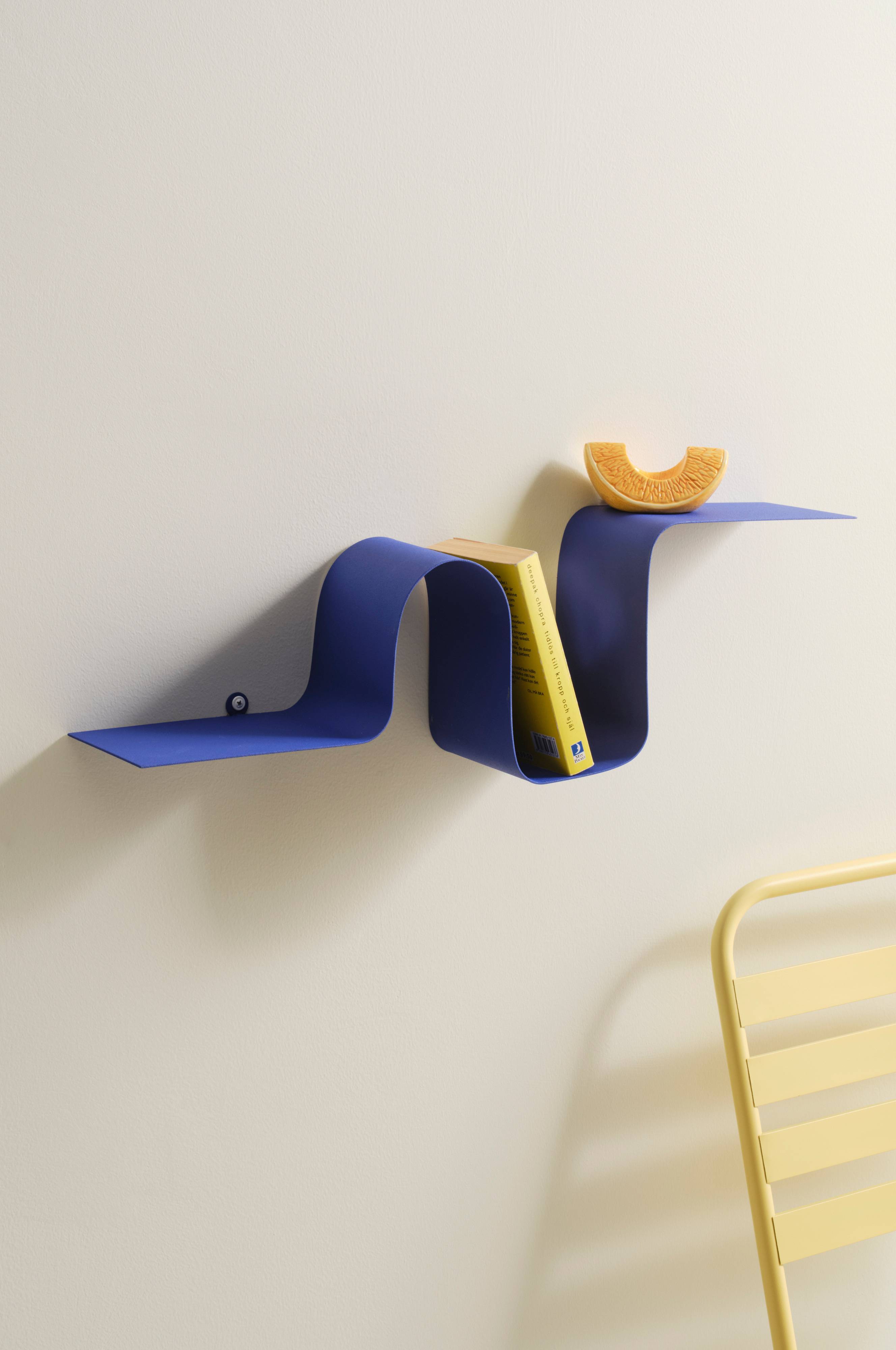 Een wandplank van metaal met een unieke, speelse vorm. Een strak en praktisch model met gaatjes voor montage aan de wand. De verschillende kleuren hebben een verschillende afwerking. De zwarte is mat gelakt, paars en groen hebben een geruwde afwerking en de metallic kleur heeft een geborsteld oppervlak.