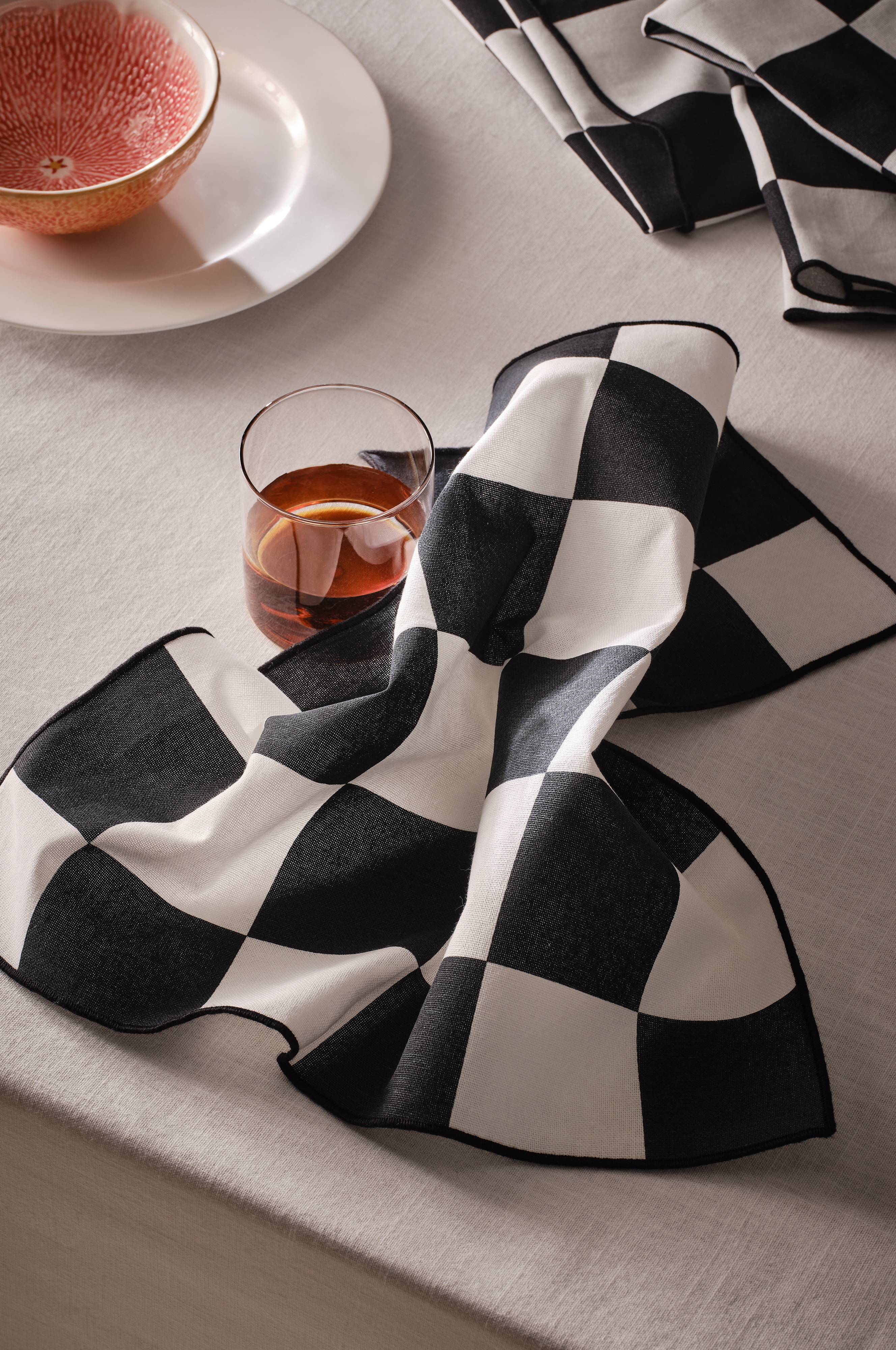 On-trend servetontwerp met ruitpatroon brengt charme in elke eetsetting. Set van vier katoenen servetten met overlockstiksels voor extra stijl.