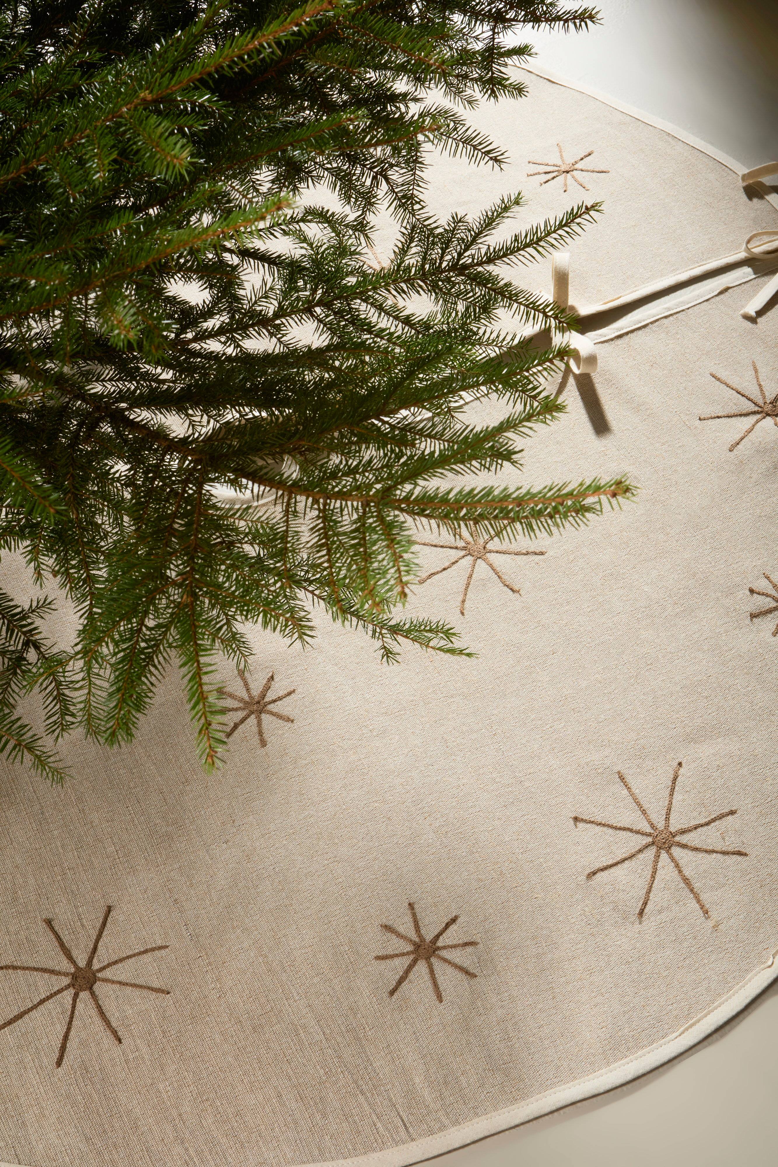 Een kerstboomrok/kerstboomkleed van jutemix met een bies rondom en geborduurde sterren. Je kunt CHARON gebruiken als een rok over de kerstboomvoet, zodat deze over de voet hangt. Je kunt hem ook gebruiken als een normaal kerstboomkleed op de vloer onder de kerstboom. CHARON heeft een gat in het midden en een opening met strikbandjes. 400 g/m².