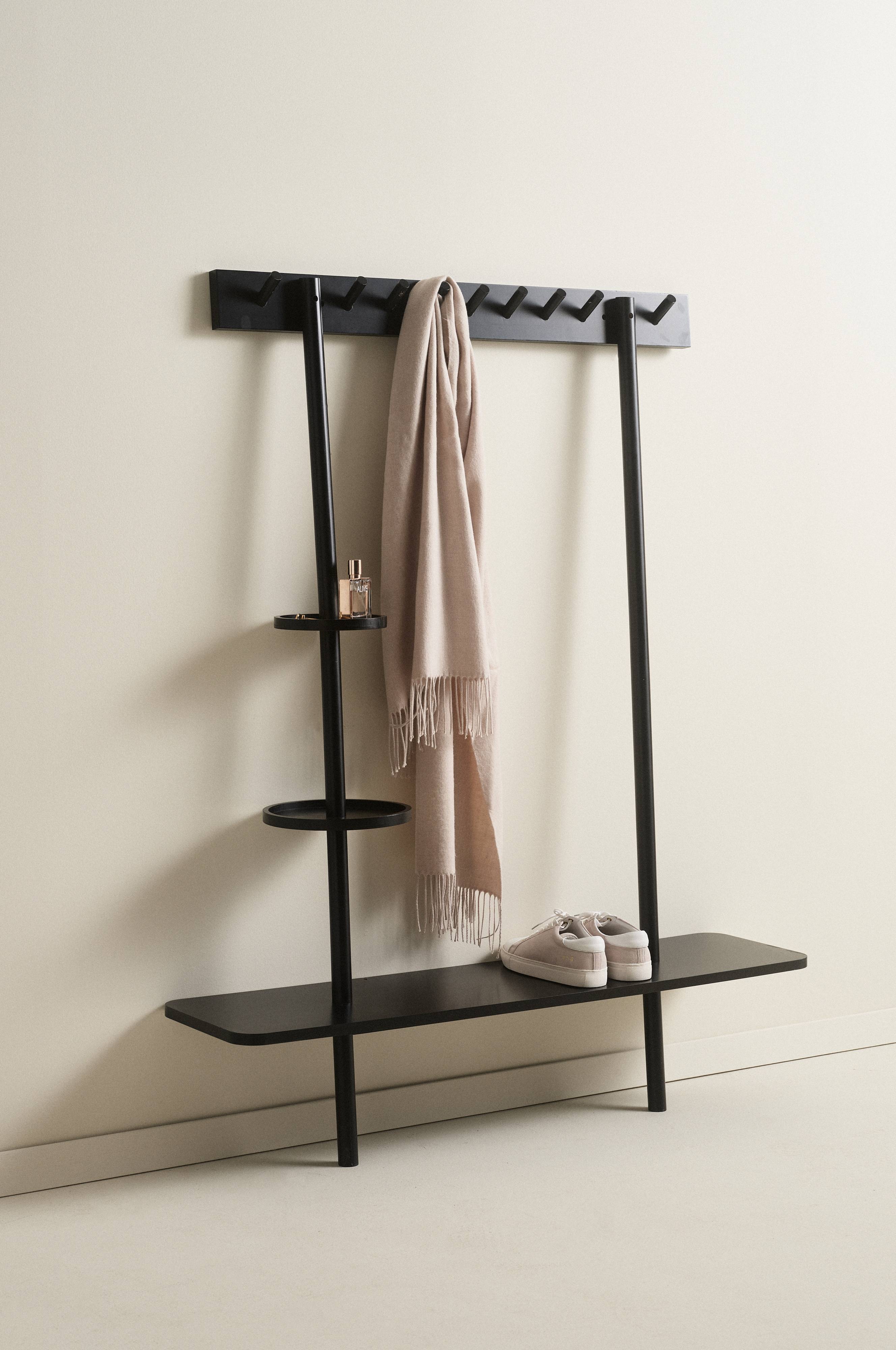 Een kapstok van mdf, heel praktisch als halmeubel. De kapstok heeft een knoppenlijst boven, twee rondje plankjes voor kleine spullen en een grotere plank onderaan voor schoenen en tassen. De kapstok staat schuin tegen de muur en wordt met de meegeleverde schroeven aan de muur bevestigd. CLARET is een fraaie kapstok waarmee je je kleding en schoenen gemakkelijk netjes opbergt. Enige montage is vereist. Montage-instructies worden meegeleverd.