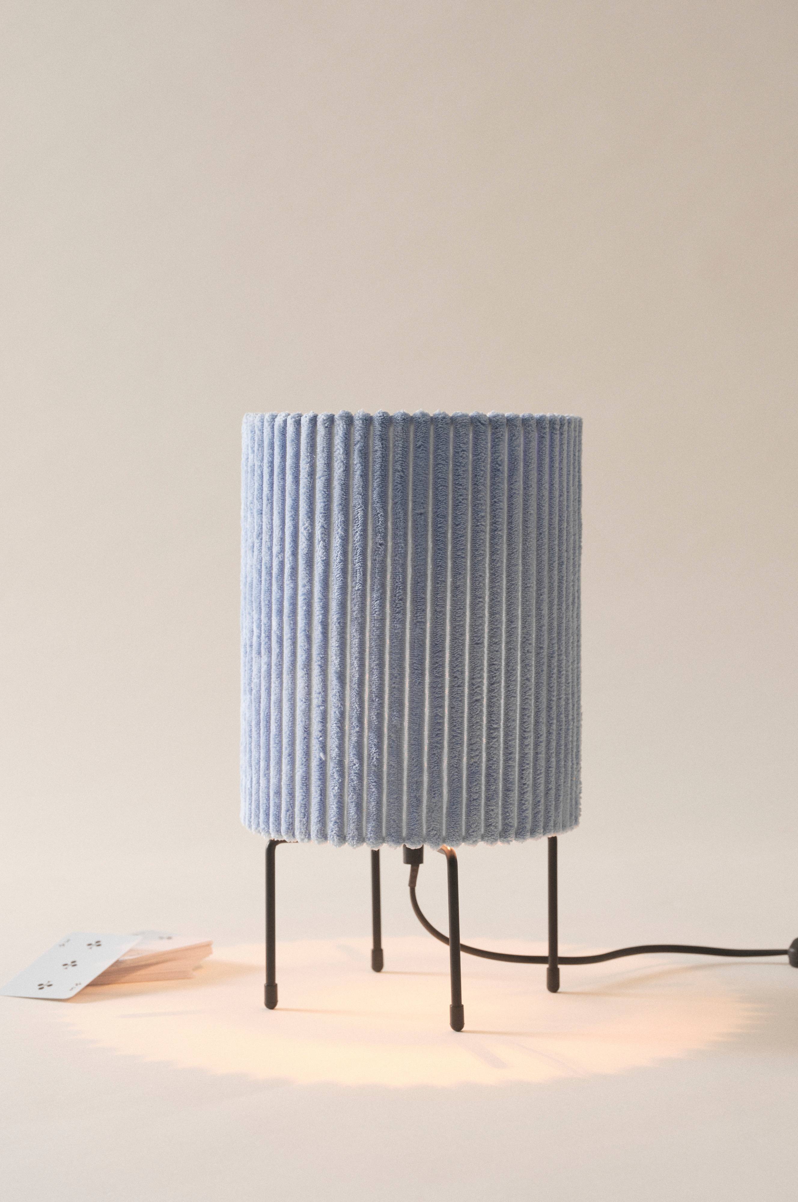 En tafellamp met een effen lampenkap van geribd fluweel (corduroy). De matte, ijzeren pootjes hebben beschermende dopjes onderaan. De lampenkap heeft een ijzeren frame en is aan de binnenkant geplastificeerd. Schakelaar op het snoer. De lamp is ongeaard, klasse 2.