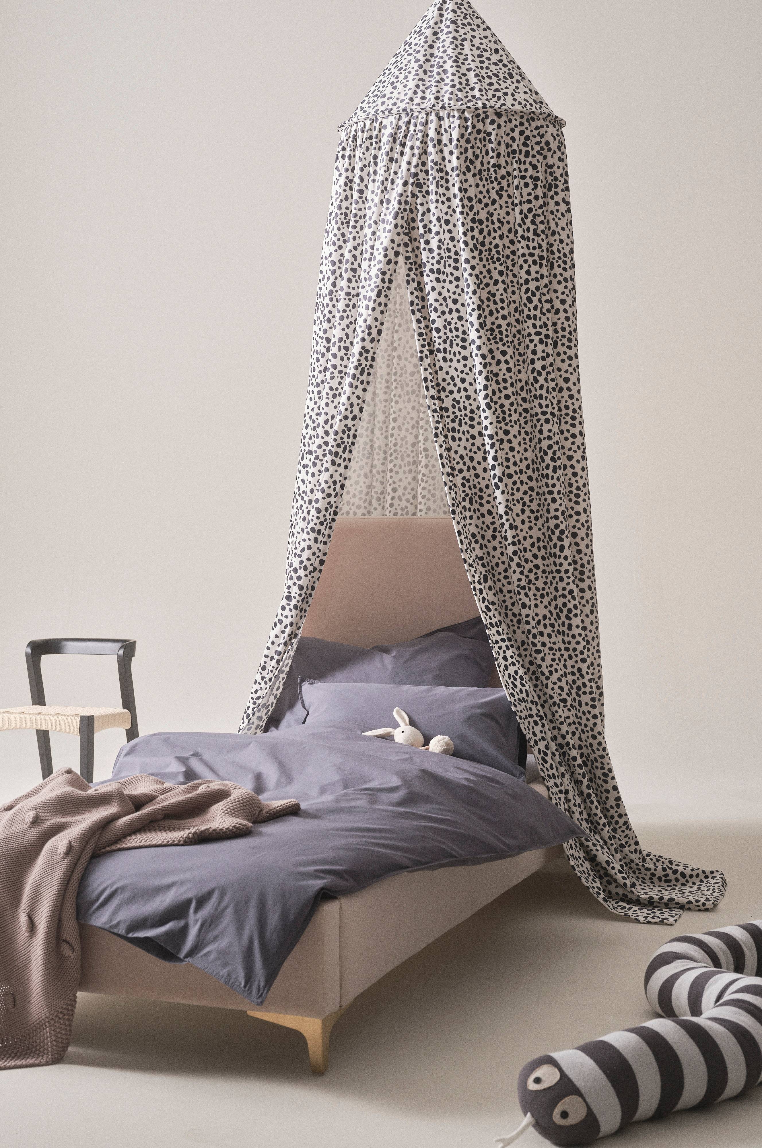 Een bedhemel van zacht, soepel fluweel van polyester met een mooie dalmatiërachtige print. Deze bedhemel is rond aan de bovenkant en open aan de voorkant. Met een bedhemel boven een kinderbed creëer je een knusse omgeving om lekker te gaan slapen.
