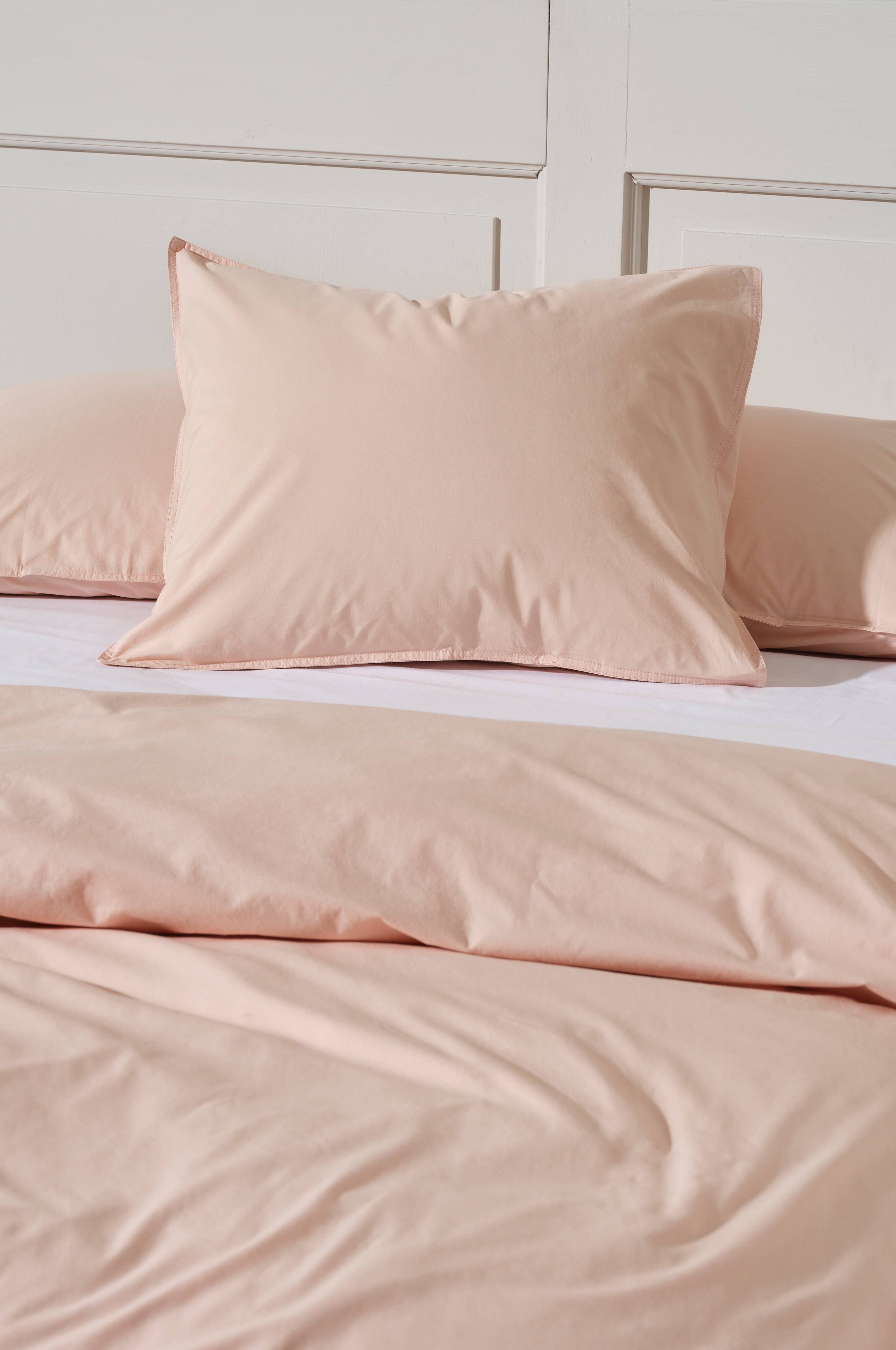 Een kussensloop van gewassen biologisch katoenen perkal. Beddengoed van katoen voelt licht en zacht aan. Draaddichtheid 200. (De draaddichtheid geeft het aantal draden aan per vierkante inch van een stof. Hoe hoger de draaddichtheid, hoe hoger de kwaliteit).