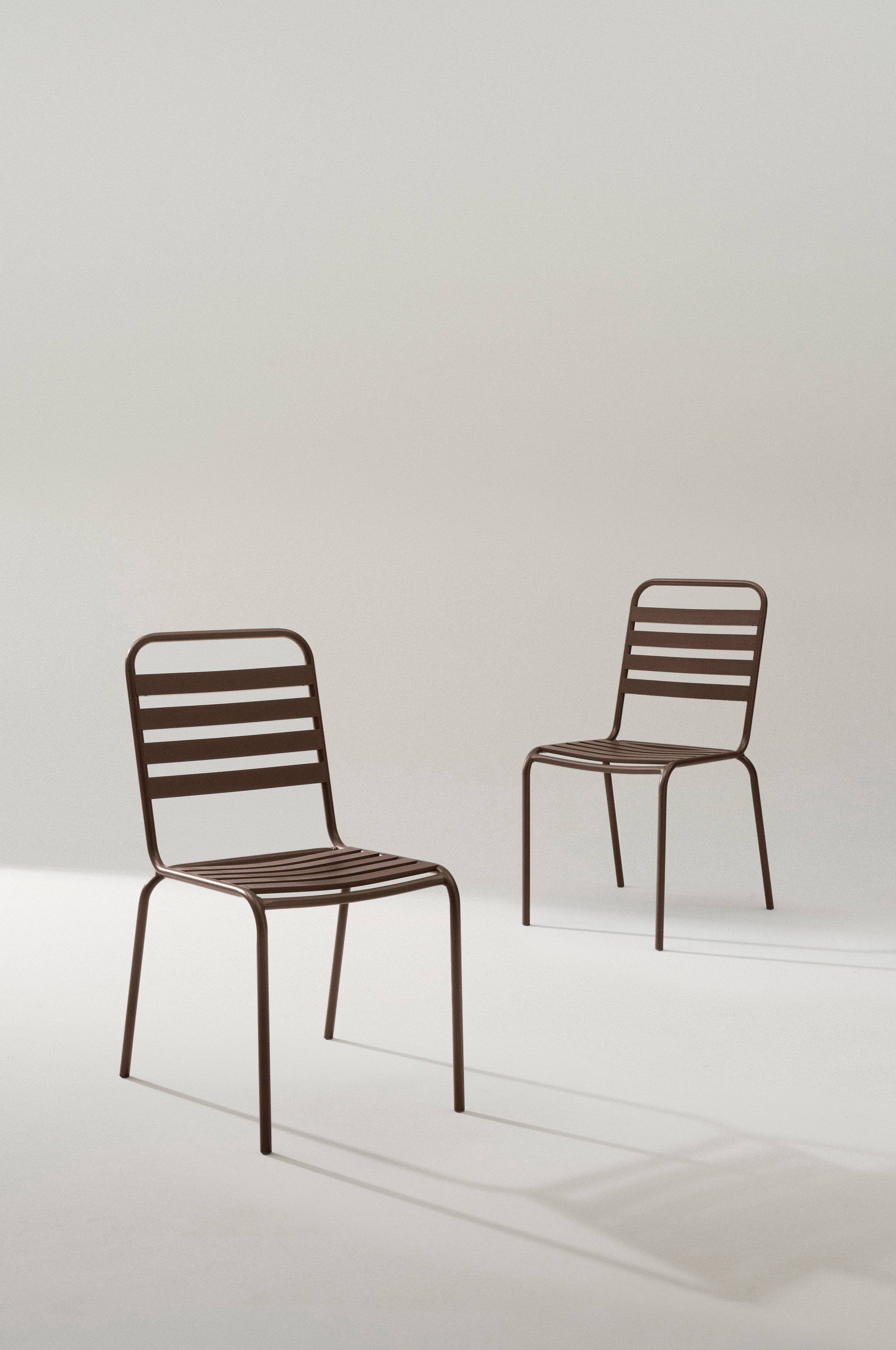 Een set van twee stoelen van gepoedercoat aluminium. De stoelen zijn praktisch en komen in allerlei situaties van pas. Door het slanke design passen ze ook op het balkon. DEIO is gemaakt van aluminium, waardoor de stoelen zonder te roesten buiten kunnen staan en eenvoudig afgenomen kunnen worden. De stoelen zijn stapelbaar.