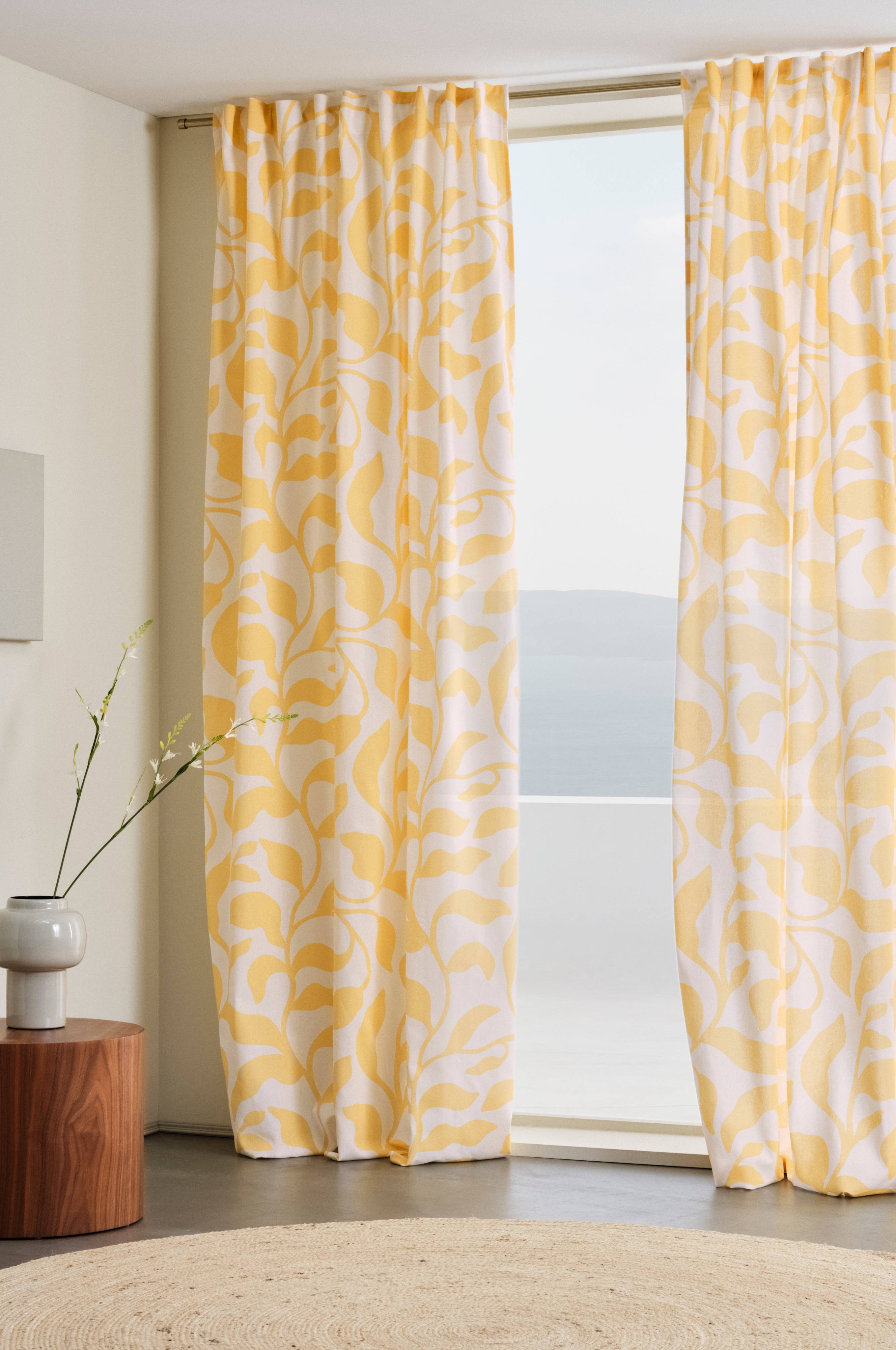 Twee stroken gordijnen in semi-panamakatoen. De verschillende onderdelen van de serie DELLA worden gekenmerkt door een charmant bladdessin in een zomerse kleur geprint op een witte ondergrond. DELLA heeft een vastgestikt multifunctioneel gordijnband en kan met vingerhaken, roedetunnel of blinde lussen worden opgehangen. Gramsgewicht 170 g/m².