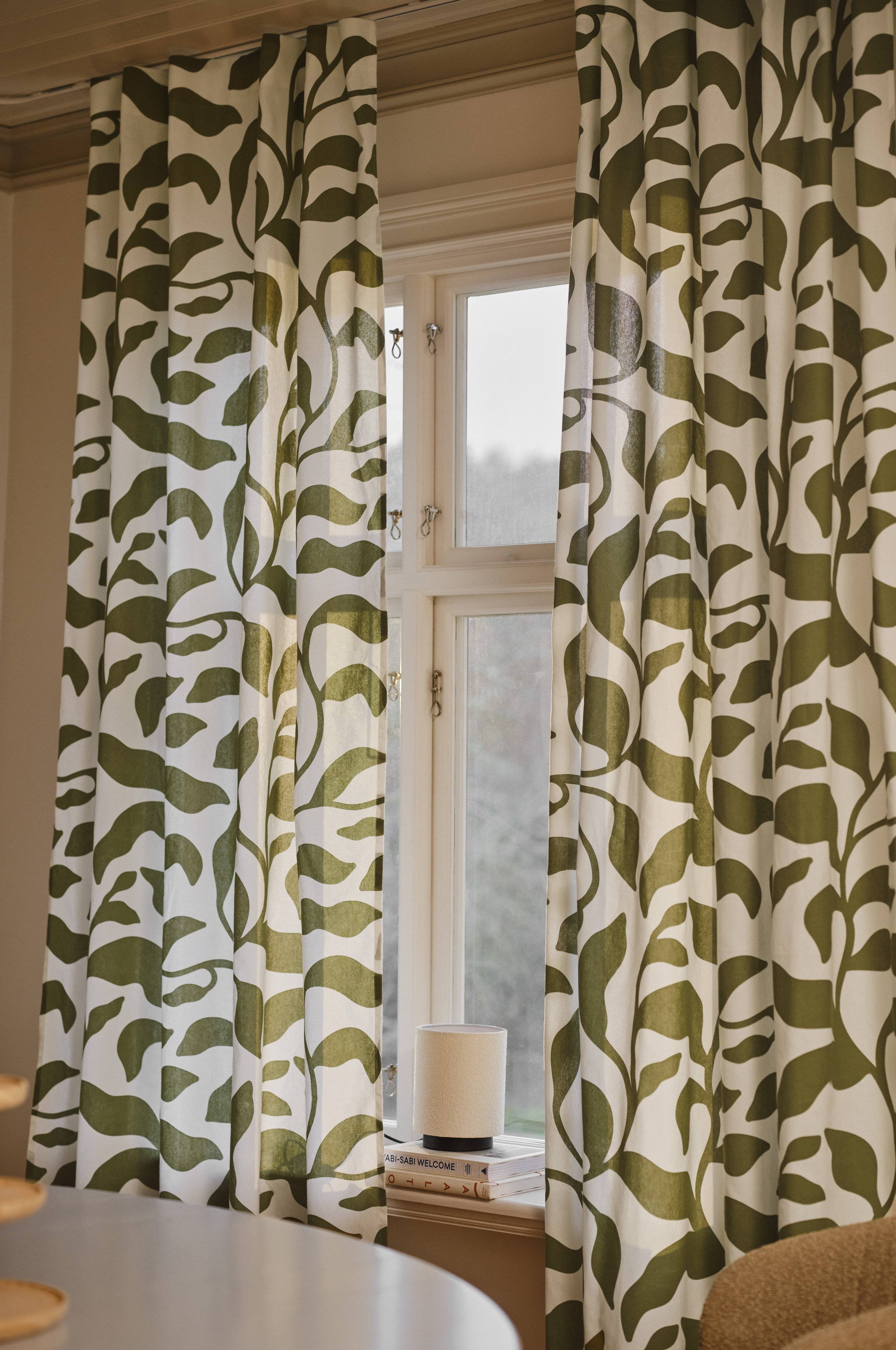 Twee stroken gordijnen in semi-panamakatoen. De verschillende onderdelen van de serie DELLA worden gekenmerkt door een charmant bladdessin in een zomerse kleur geprint op een witte ondergrond. DELLA heeft een vastgestikt multifunctioneel gordijnband en kan met vingerhaken, roedetunnel of blinde lussen worden opgehangen. Gramsgewicht 170 g/m².