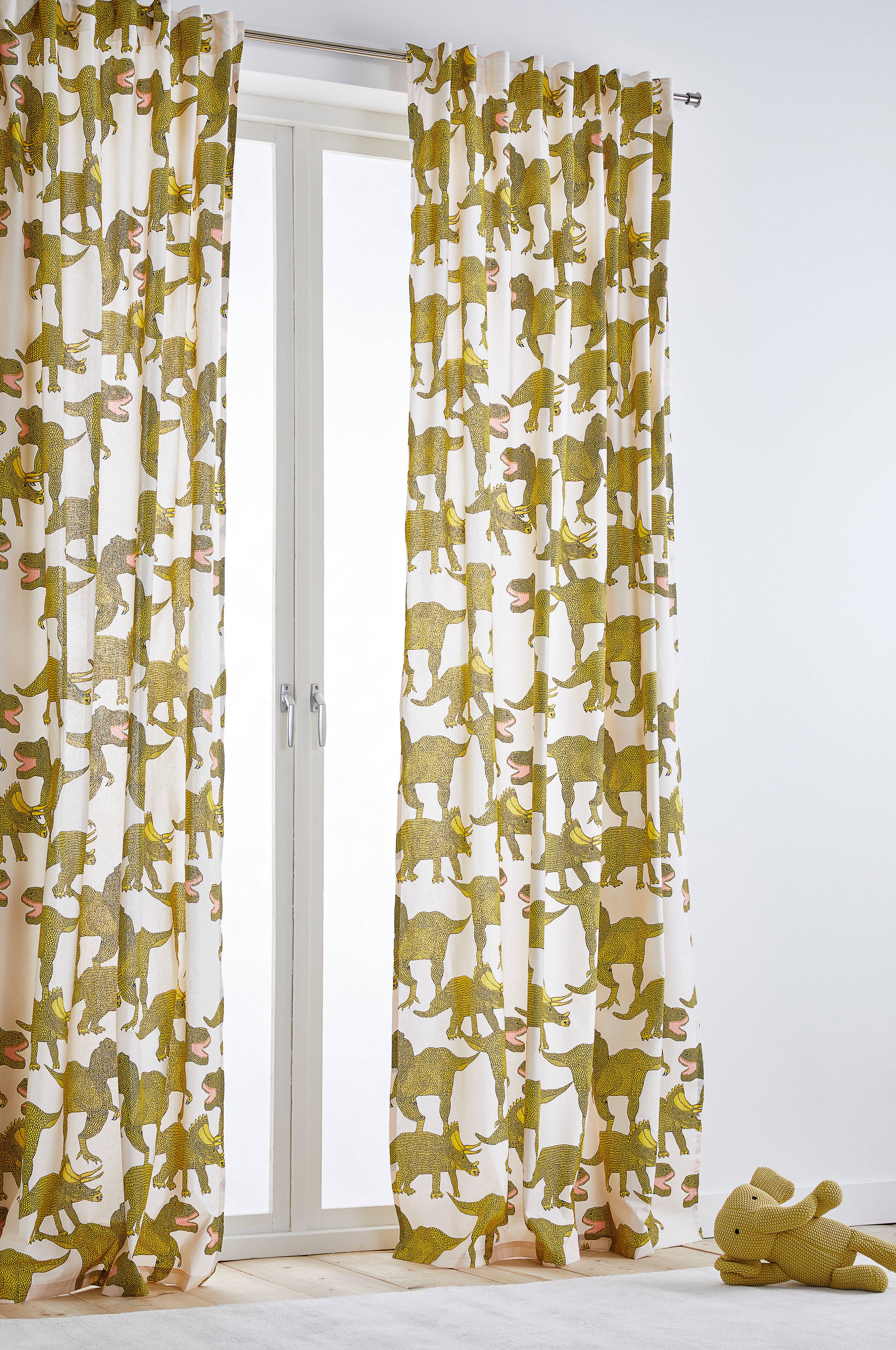 Een set van twee gordijnen van zacht biologisch katoen met een vastgestikte multifunctionele gordijnband. Het gordijn heeft een geprint dessin met lieve kleine dino's. Het multifunctionele gordijnband geeft je de keuze om het gordijn met blinde lusjes, met een roedetunnel of met een plooiband voor vingerhaken op te hangen.