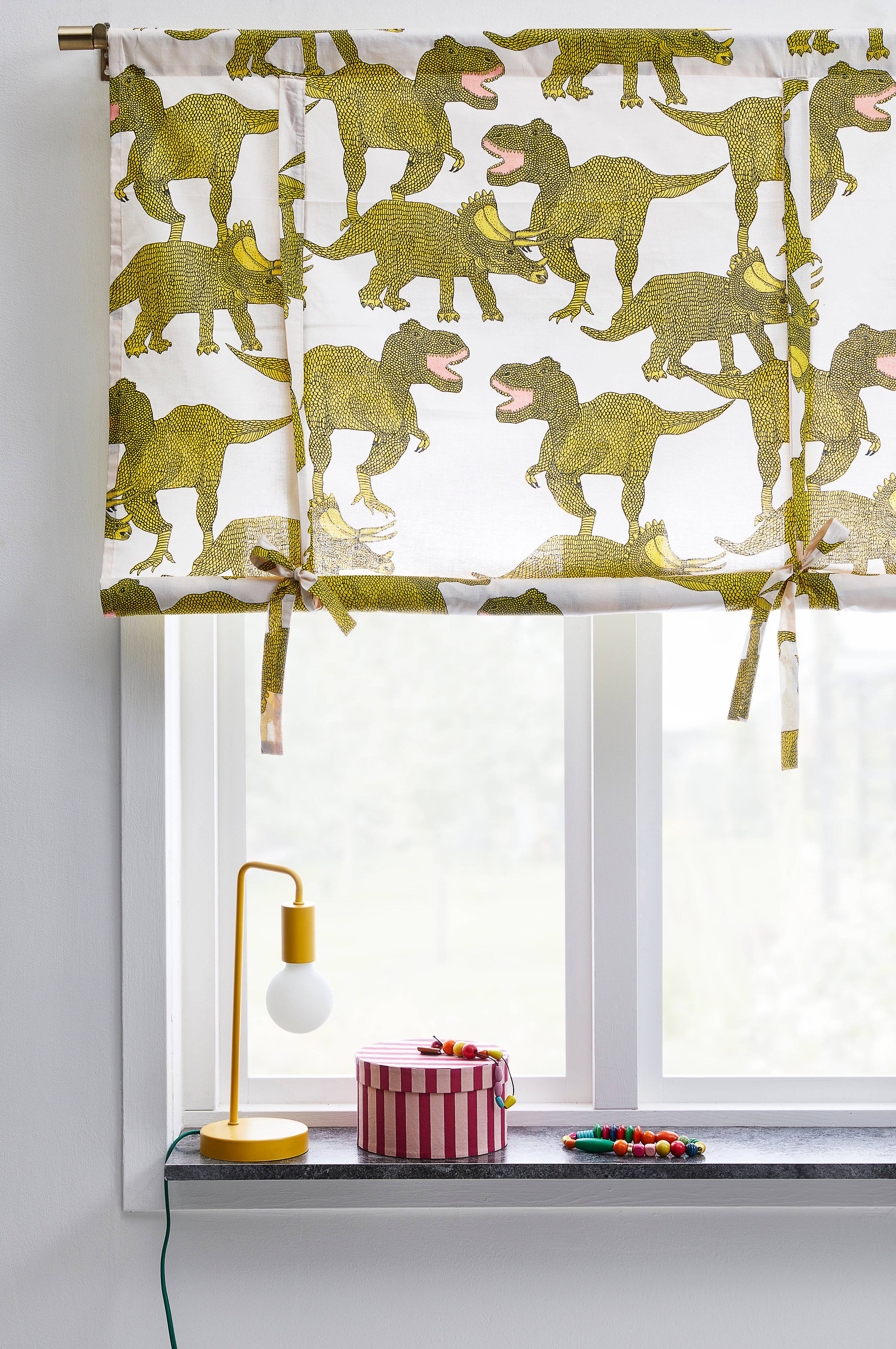 Een oprolgordijn van zacht en biologisch katoen met geprint dessin met lieve kleine dino's. Het gordijn wordt aan een gewone gordijnroede gehangen. De hoogte wordt versteld met behulp van de strikbandjes.