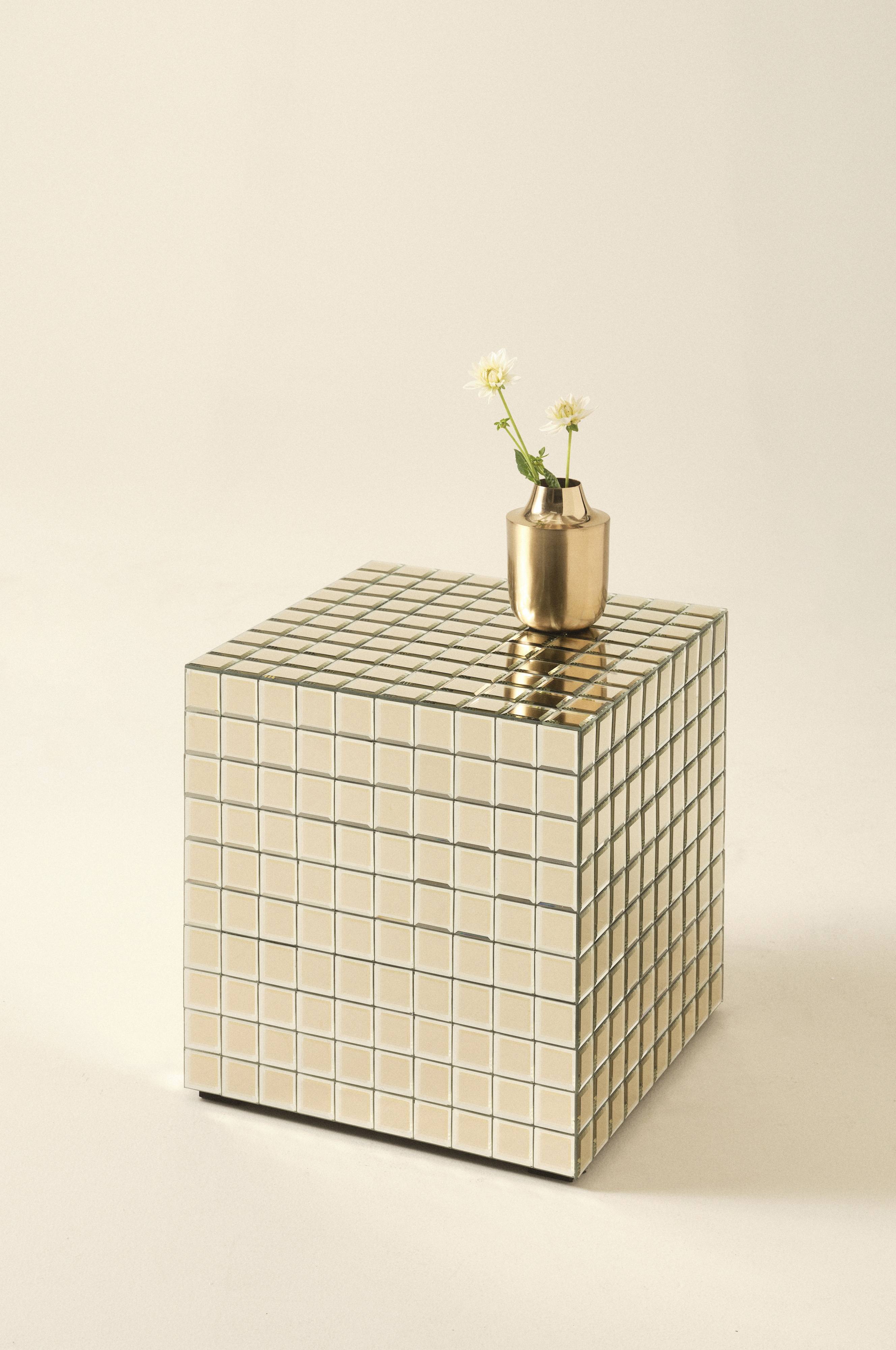 Een kubusvormige bijzettafel met spiegel-mozaïek waarbij elk mozaïekstukje is voorzien van geslepen randen. Het frame is gemaakt van FSC-gecertificeerd MDF. De luxueuze bijzettafel geeft de ruimte een echte boost met een stukje glamour. Je kunt hem als een fraaie bijzettafel bij je zithoek zetten, maar hij doet het ook prima als je hem apart zet met een mooie plant of decoratie erop.