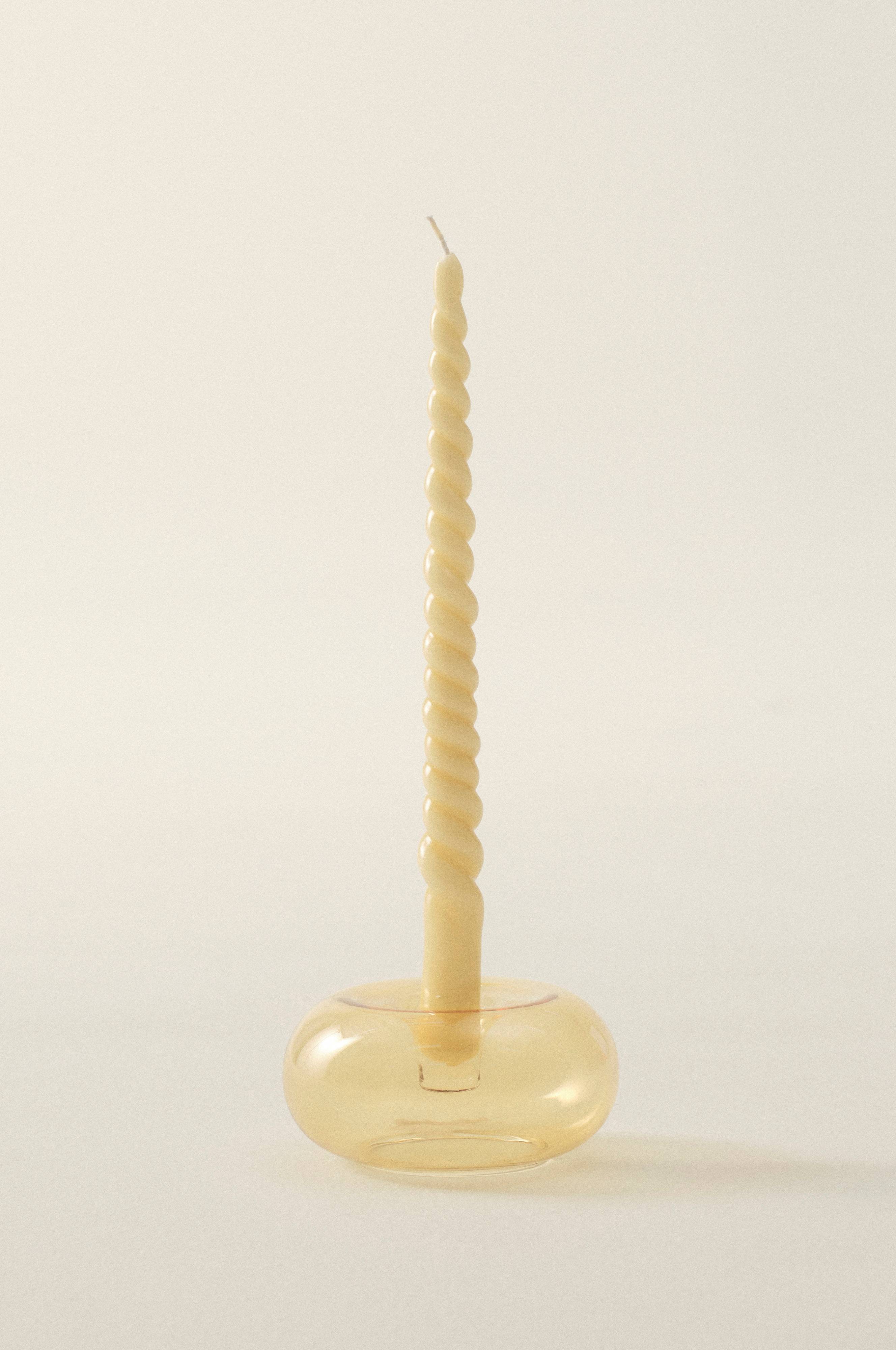 Een kandelaar van glas in diverse mooie kleuren om uit te kiezen. De ronde kandelaar is vlak aan de onderzijde en staat stevig op tafel. Kaarsen zijn niet inbegrepen.