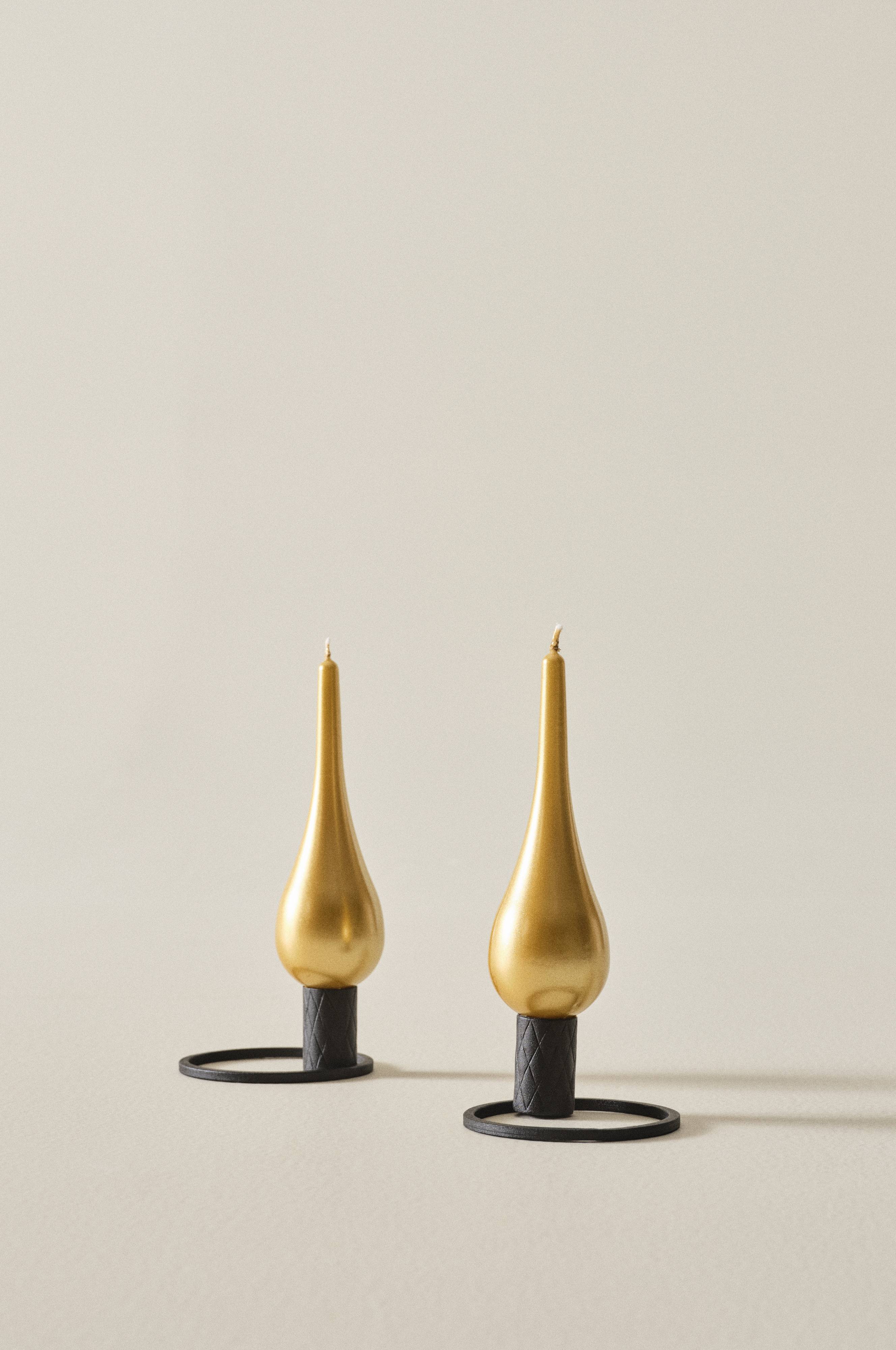 Een set van twee druppelvormige kaarsen van stearine die vervolgens in een metallic kleur zijn gedoopt. Deze mooie kaarsen zijn met de hand gemaakt in Zweden. Ze zijn druppelvormig en hebben een voetje waardoor ze in een gewone kandelaar passen. Kaarsen zijn een eenvoudige manier om het thuis gezellig te maken. Deze kaarsen branden met een grote, heldere vlam en de stearine bevat geen palmolie.