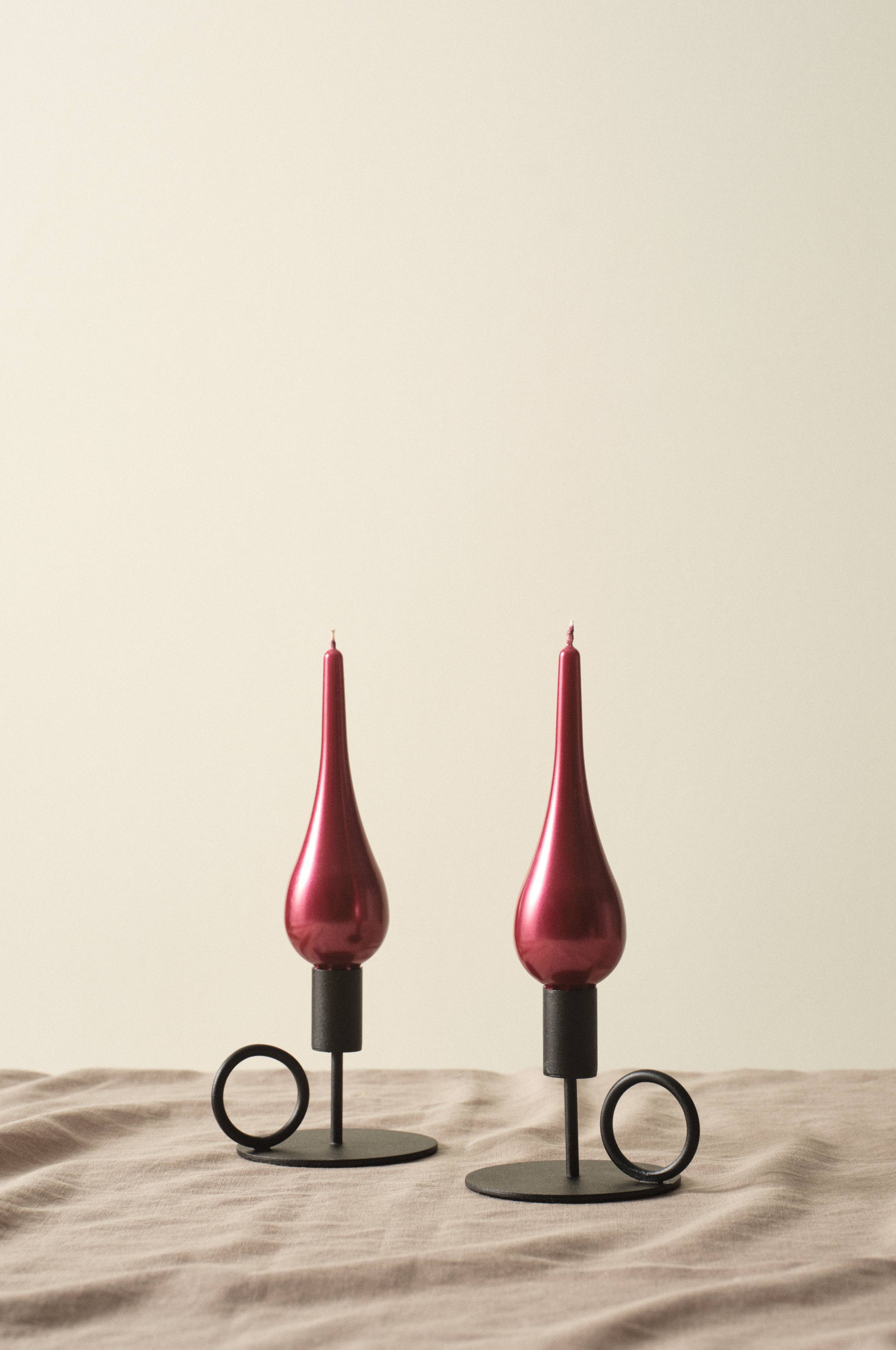 Een set van twee druppelvormige kaarsen van stearine die vervolgens in een metallic kleur zijn gedoopt. Deze mooie kaarsen zijn met de hand gemaakt in Zweden. Ze zijn druppelvormig en hebben een voetje waardoor ze in een gewone kandelaar passen. Kaarsen zijn een eenvoudige manier om het thuis gezellig te maken. Deze kaarsen branden met een grote, heldere vlam en de stearine bevat geen palmolie.