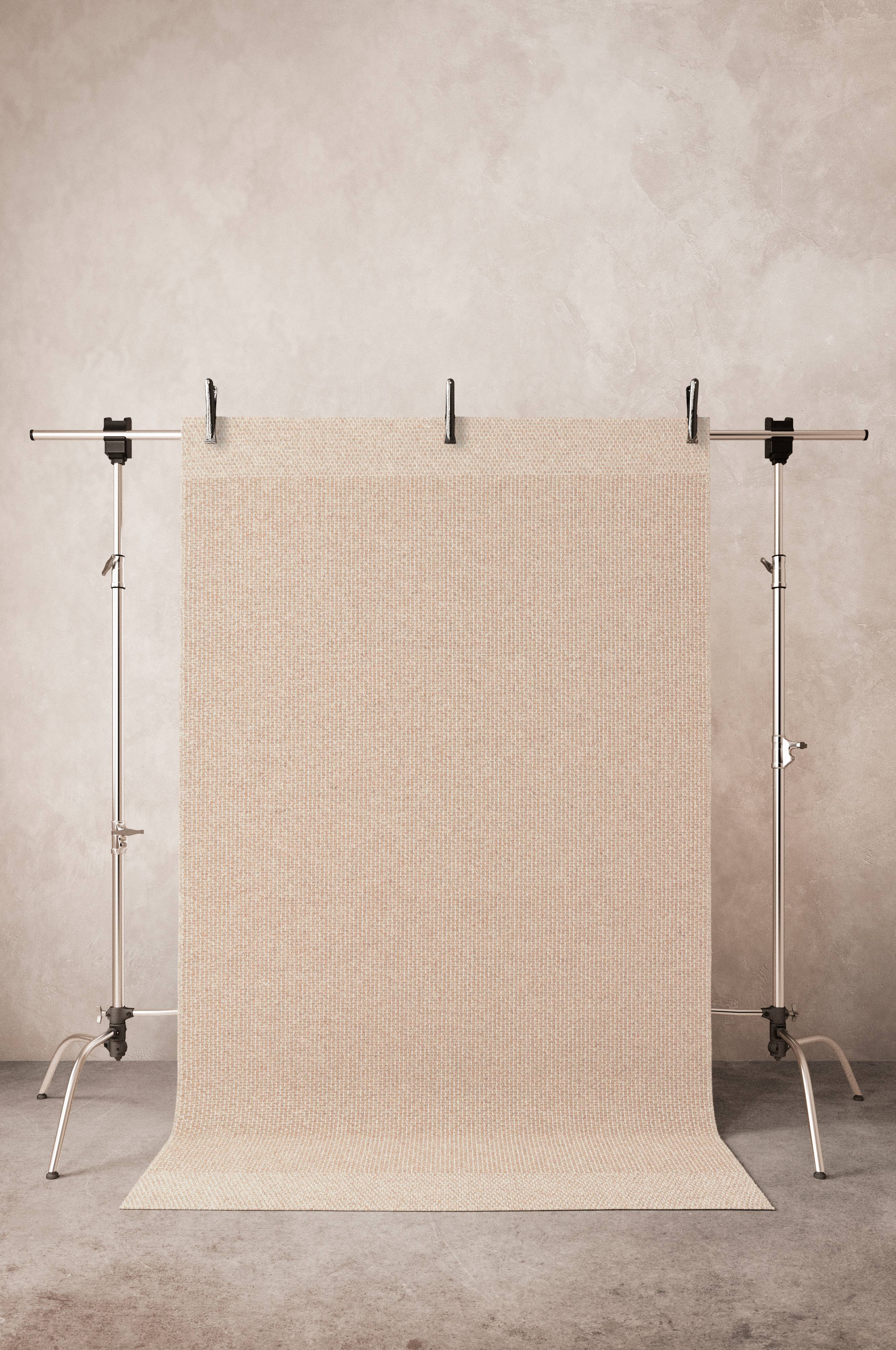 Een gladgeweven vloerkleed van een mix van polypropyleen, wol en polyester. Het vloerkleed heeft een natuurlijke look met kleine details en een structuur die het vloerkleed zijn specifieke look geven. Het vloerkleed heeft een discreet, ingeweven streepdessin met een rand langs de korte zijden. Van een bepaalde afstand krijgt het vloerkleed een gemêleerd karakter. Dikte 0,5 cm. 1450 gr./m².