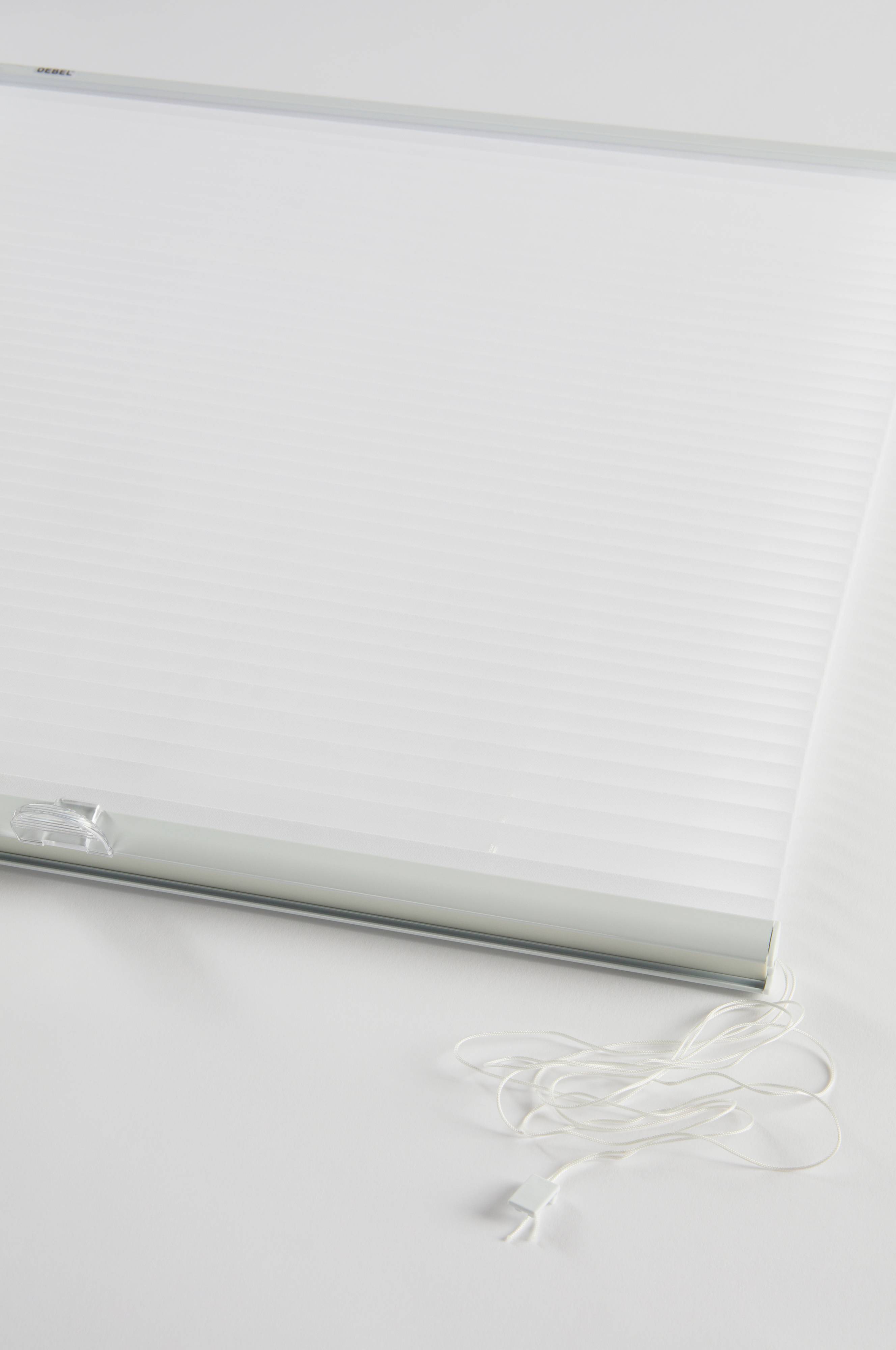 Het wordt versteld door middel van handgrepen in de bovenste en onderste stroken. De koorden en stroken hebben dezelfde kleur als de plooien. Indien nodig kun je ze zelf op de gewenste breedte knippen, tot 8 cm aan elke kant. Er wordt Easyfit beslag meegeleverd, waarmee je het product zonder schroeven kunt installeren op bepaalde naar binnen opengaande ramen.